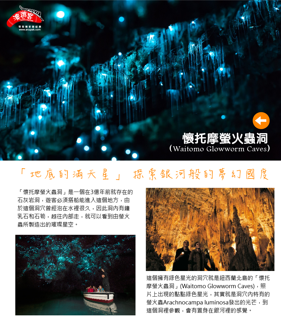 《懷托摩螢火蟲洞之旅Waitomo Caves》今日抵達Otorohanga小鎮,前往參觀世界八大奇景之一的◎『懷托摩鐘乳石螢火蟲洞』,自1887年被探勘發現至今每年吸引來自世界各地的遊客前來一看洞中奇景。領隊的帶領下進入洞中展開一段奇特的地下探險旅程,觀賞大自然巧手打造成的鐘乳石巨大岩洞,並搭乘人力拉動的小舟,無聲無息的滑入自然天成的地下黑暗河流洞穴中,於一片靜謐中欣賞螢火蟲所構築的滿空爍藍。