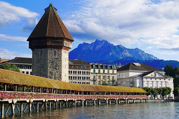 盧森的地標~卡貝爾橋是原建於14世紀初的有頂木造橋,被認為是歐洲最古老的有蓋橋。橋身裡掛有大約110多幅的版畫。1993年曾發生火災,致使木橋一半被燒毀,不過在火災第二年後即重建復原木橋的美麗。位於橋中間的八角形的水塔,是一座功能強大卻引人入勝的建築,塔高34公尺,大約於1300年修建,是城牆的一部分,曾被用作檔案室、庫房、監獄和酷刑室。今天,中層是盧森砲兵協會總部的所在地。 同時,數十年來,阿爾卑斯雨燕一直棲息在屋頂下。當這些黑白鳥從非洲冬季的家中歸來時,它們也將盧森帶回了春天。