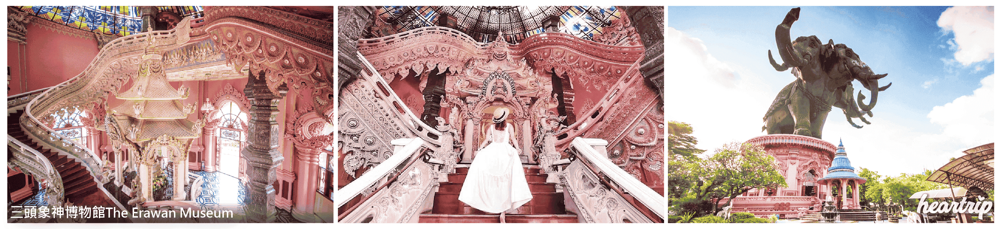 【三頭象神博物館The Erawan Museum】前往三頭象神博物館Erawan Museum參觀,遠遠便可看見高達數十公尺、青灰色的三頭象雕塑,象頭昂揚,高舉著微微捲曲的象鼻,眼睛炯炯有神望向遠方,姿態極為靈活生動,彷彿隨時可聽聞洪亮的象鳴聲。這座無與倫比的博物館,是泰國富翁Lek Viriyapant花費12年的時間,斥資數千萬元重金打造而成,不僅保存泰國傳統工藝,更希望藉由精緻而博大的宗教建築,向世人宣揚世界和平、四海一家的理念,是泰國自由行推薦必訪景點。