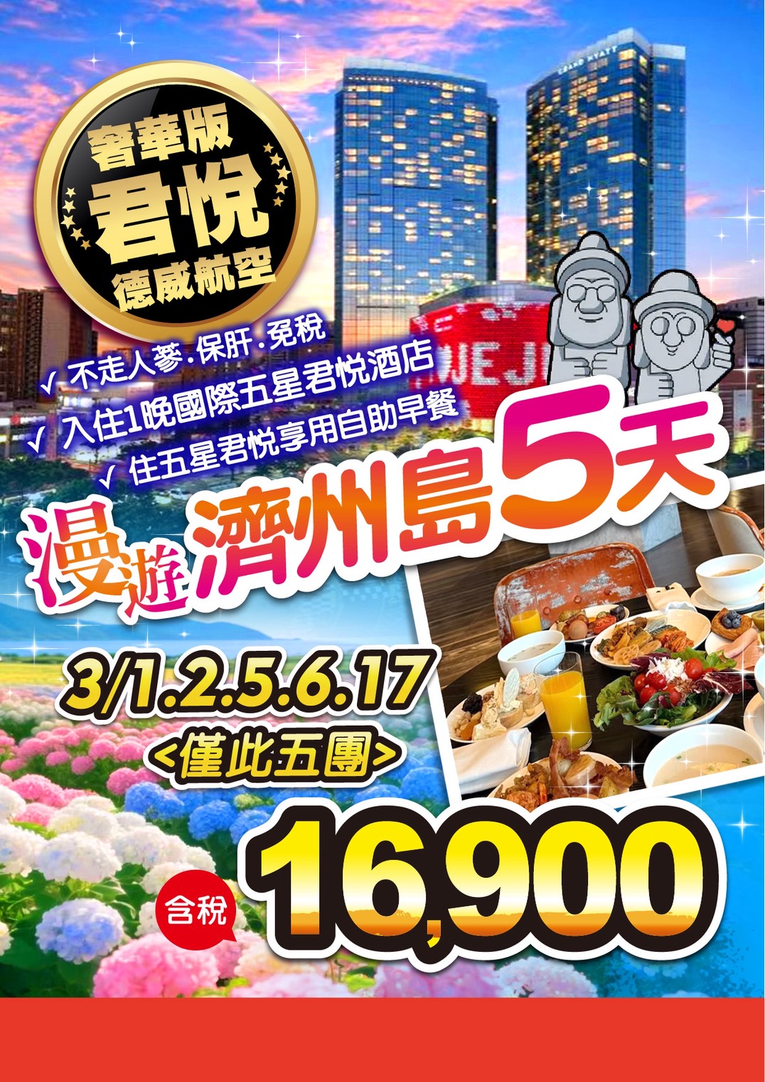 住宿:Jeju in Hotel 或 SIMS HOTEL 或Jeju Line Hotel 或R&T Hotel 或 Benikea Hotel Jeju 或同級