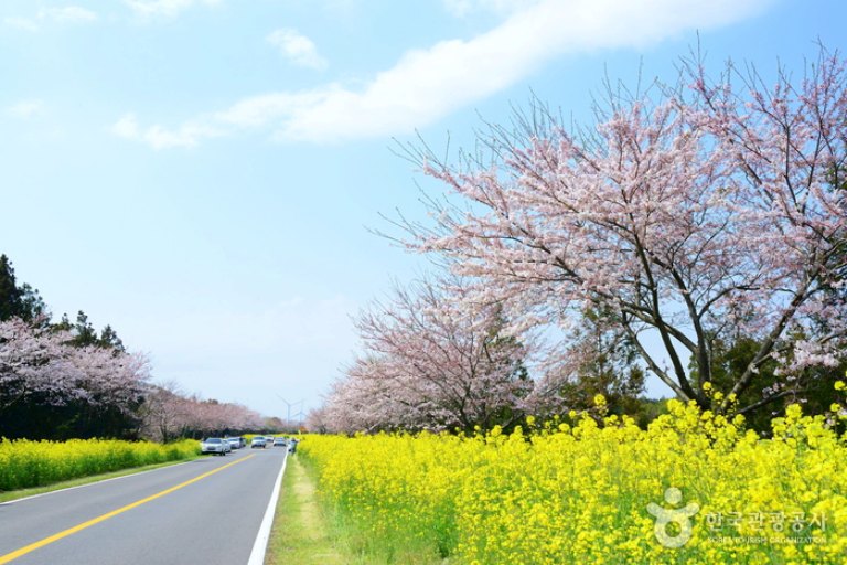 號稱濟州春天最美麗道路,春天時大片油菜花綿延,後方還有大王櫻花樹作為美麗背景,長約10km的公路又黃、又粉爭奇鬥豔,使整條道路像幅畫般美麗。