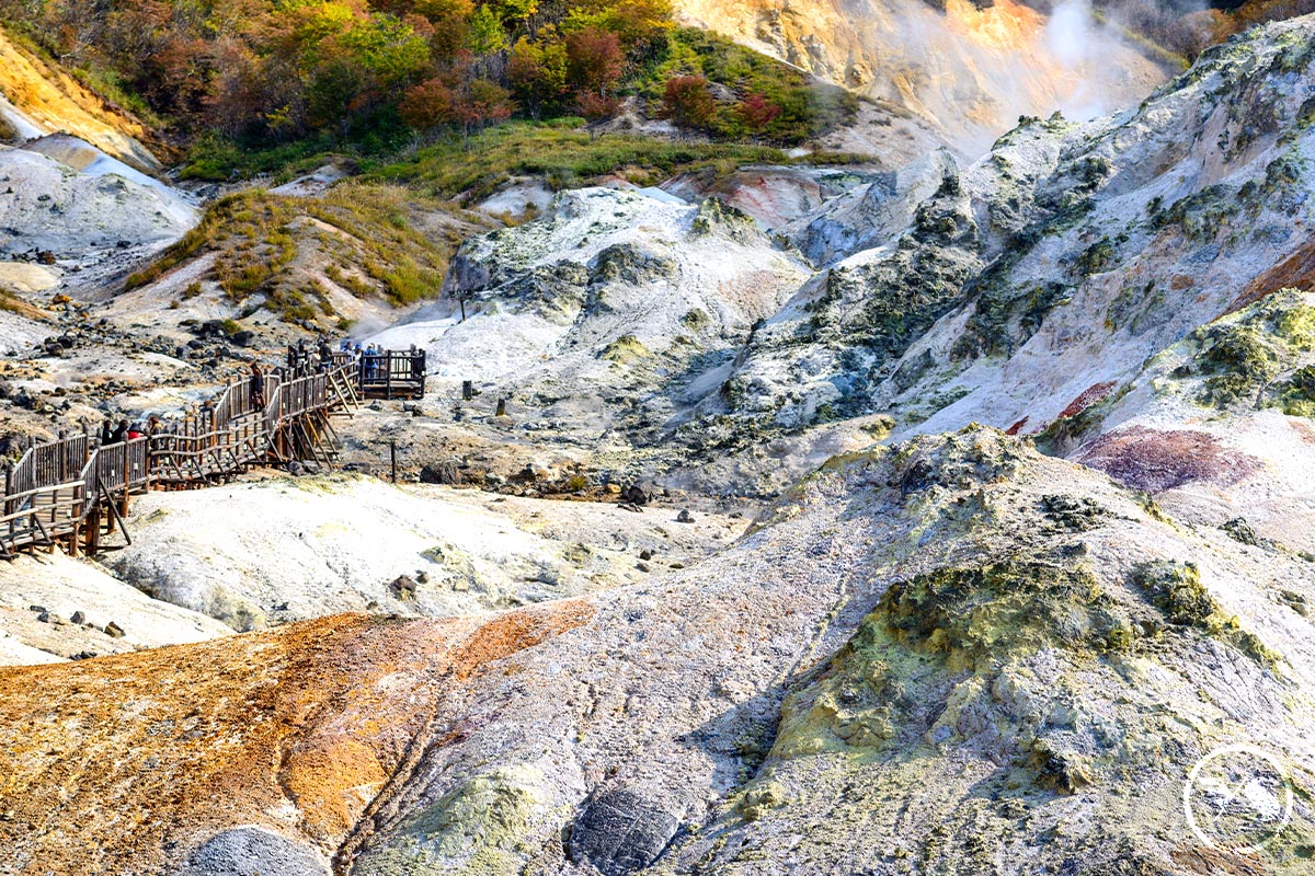 【登別地獄谷】位於登別溫泉街的東北側,是約1萬年前發生的笠山爆發所形成的噴火口,溫泉的出水量每分鐘高達3000立方公升,為登別最大的泉源,依地點不同,湧出之源泉水質亦不相同,可達11種之多。