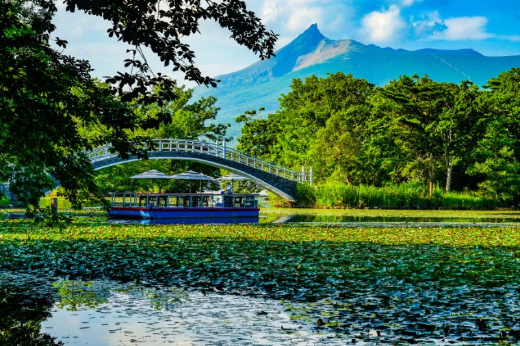 距離函館30公里,此為道南唯一的國定公園,也是新日本三景之一,素有北國的輕井澤之稱。美景天成的大小沼國立公園,湖畔林木美輪美奐,大沼和小沼兩湖之間以【月見橋】相連,秀峰駒岳倒映湖面美不勝收。