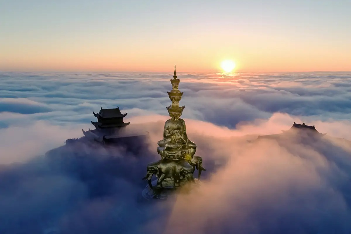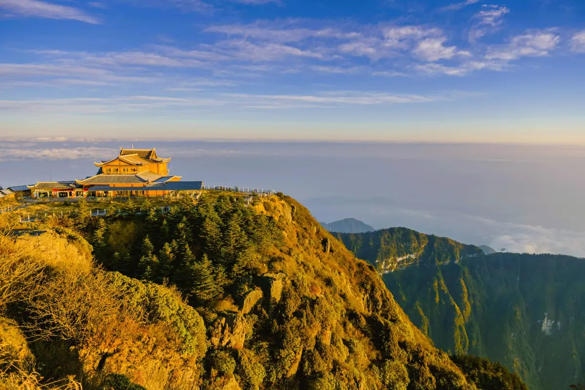 【峨眉山景區】: 峨眉山為中國四大佛教名山之一,以「雄、秀、奇、險、幽」著稱。從山腳到金頂,植被由闊葉林轉為冷杉林,生態豐富。金頂海拔 3079 公尺,是觀雲海、佛光、日出與聖燈的最佳地點。金頂的十方普賢銅像金光閃耀,氣勢巍峨。觀光車與索道讓登山更輕鬆,沿途可欣賞山谷、森林與雲海。峨眉山兼具自然景觀與佛教文化,是四川最具代表性的世界遺產。