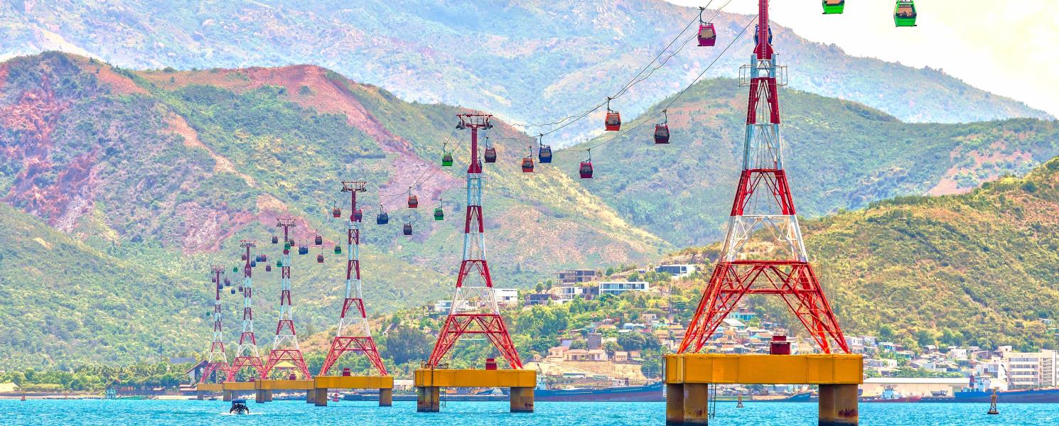 總長約3300公尺的跨海纜車,平均高度54公尺,每車廂最多乘載12名,全程約10-12分鐘。從芽莊延伸至珍珠島,十分壯觀;在高空中緩緩移動,可以體驗到海上跨越的感覺,獨享360度寬闊視野與腳下的湛藍海景,纜車也可以如此浪漫!