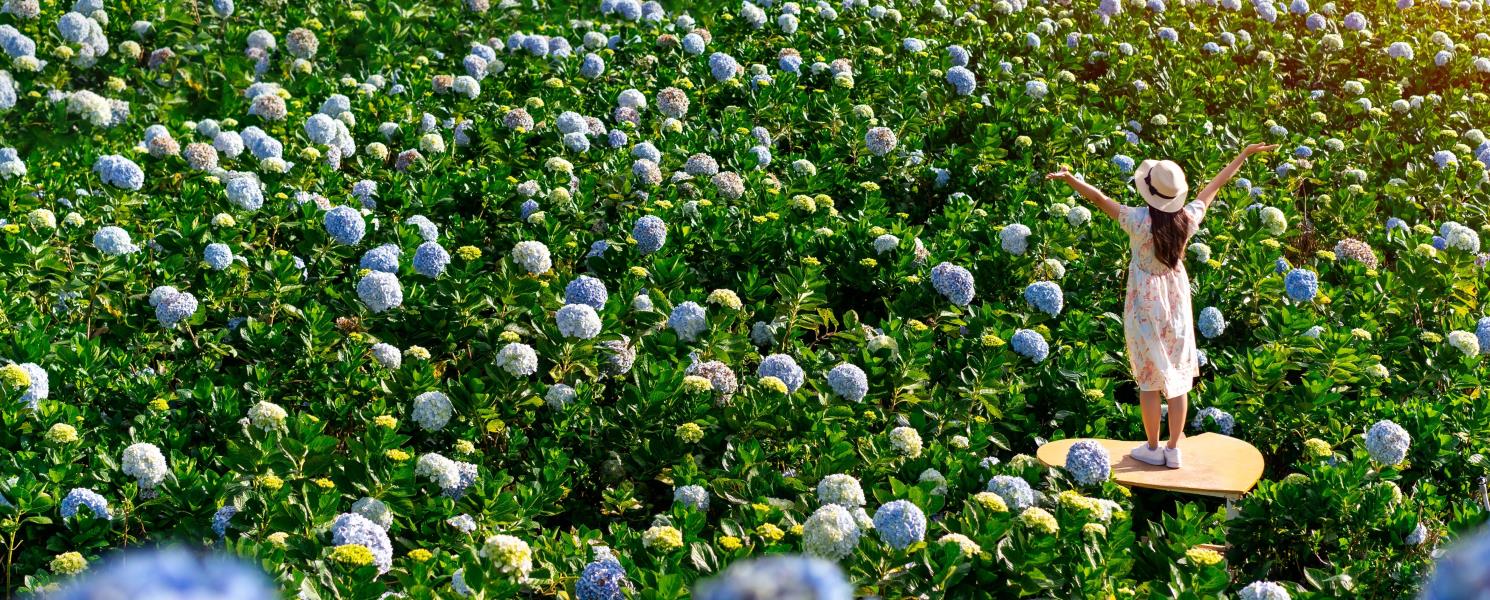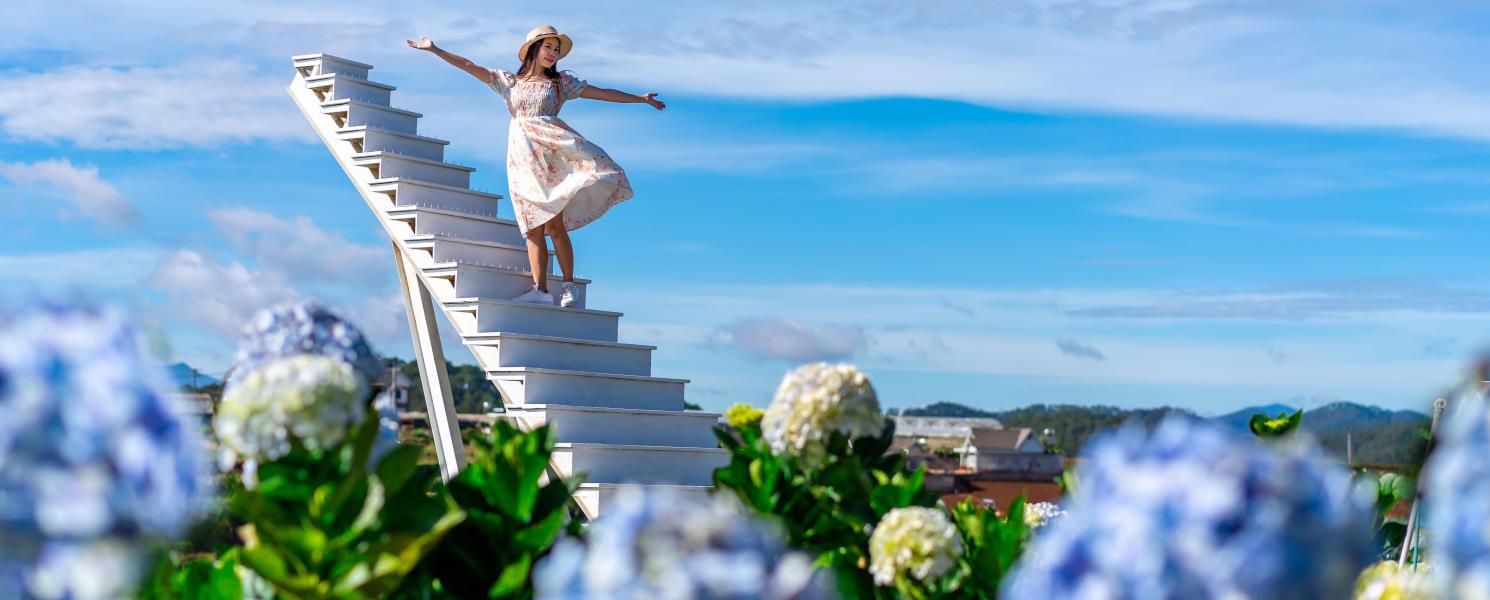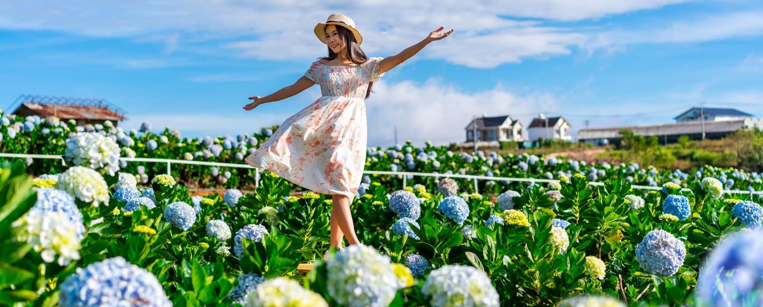 大叻繡球花園位於清涼宜人的山城之中,大片藍、紫、粉色繡球花沿著坡地綻放,層層花海與松林、薄霧相互映襯,勾勒出夢幻景色。漫步園內,微風徐來、花香淡雅,彷彿走進童話世界,是大叻最具浪漫氛圍、拍照打卡不可錯過的經典景點。