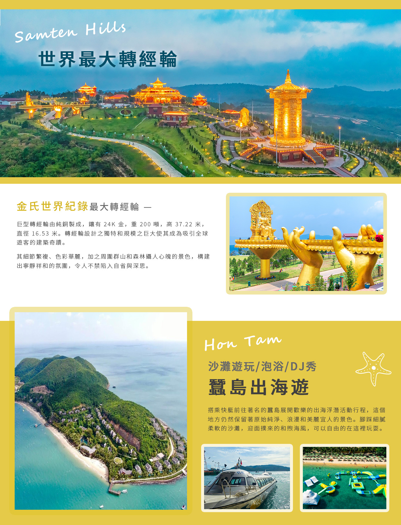 【蠶島Hon Tam Island出海一日遊】搭乘快艇前往著名的蠶島展開歡樂的出海浮潛活動行程,儘管芽莊旅遊產業發展很多年,但這個地方仍然保留著原始純淨、浪漫和美麗宜人的景色。 碧海藍天,微浪起伏,腳踩細膩柔軟的沙灘,迎面撲來的和煦海風,讓遊客可以自由的在這裡嬉戲玩耍。從空中俯瞰這座島嶼就像一隻小蠶,因此名為蠶島,是芽莊具有特色的島嶼之一。 島上被綠色植物填滿,像走進了原始深林的感覺遮天蔽日,如果經過一場雨的洗禮,那空氣就會格外清新,海水拍打著礁石奏響山與水的樂章。蠶島是目前芽莊諸多海島中設施最完善島海島之一,綿延的細白沙灘,宛如踏上麵粉島,在這您可在沙灘戲水或在氣墊水上設備上盡情活動,也可在島上的數個泳池游泳玩樂或自費享用飲料,中午在島上享用午餐,島上遊客多,遊客多在11:30-13:00前往用餐 ,下午島上會不定時安排歌舞表演,表演區靠近泳池吧台區,陽光、沙灘、2400平米泳池和占地大的休憩區,其他水上自費活動,請參照島上公告的費用自費選購,在此我們享受芽莊最迷人的海島假期。
