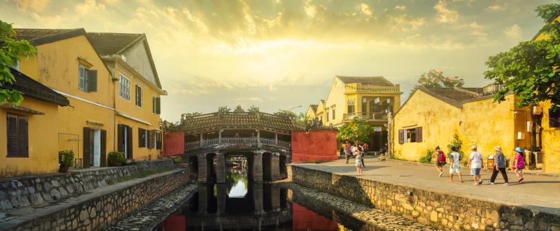 會安唯一古橋,這木造橋橫跨流入秋盆河的小渠,連接阮氏明開和陳富兩街,由日本和中國商人籌建於17世紀初。日本橋長18米,蓋陰陽瓦,建築獨特,寺和橋均為木製,橋兩頭設置坐姿猴和狗雕像,相傳是古代日本尊崇的吉祥物。