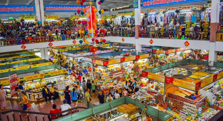 來到韓江市集體驗峴港生活,當地人家的日常用品種類應有盡有。兩層的建築設計,一樓為食物專區,有名的越南河粉、越南版法國麵包,各種風味小吃都在此嚐鮮,甚至南國水果特產也一應俱全。二樓多為服飾類。