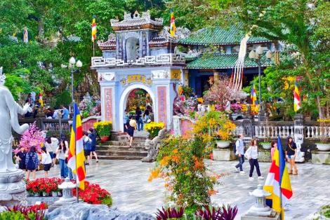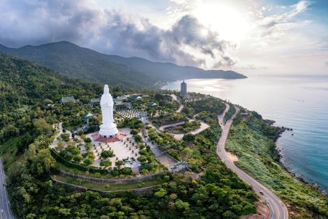 距離峴港市中心約半小時車程,可以鳥瞰整個峴港市。沿途景色不在話下,觀山觀海,各取所需。山上觀音像高達67公尺,據說是亞洲第一高,以大理石做成,肅穆非常,旁靈應寺擺設羅漢,姿勢各異其趣!