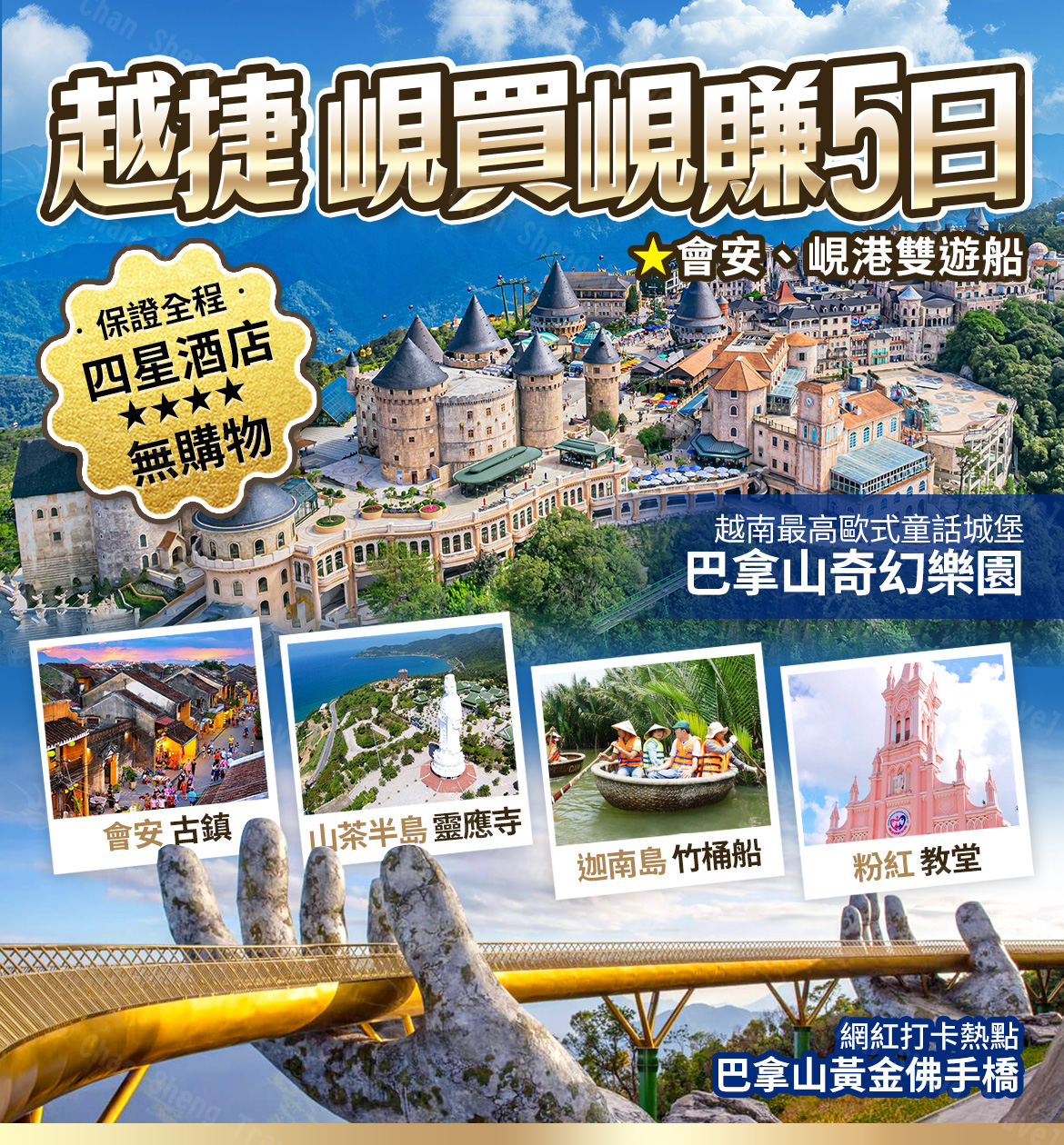 越捷航空.峴買峴賺 I~巴拿山佛手橋、會安、峴港雙遊船、迦南島竹籃船5日《全程四星酒店.無購物》