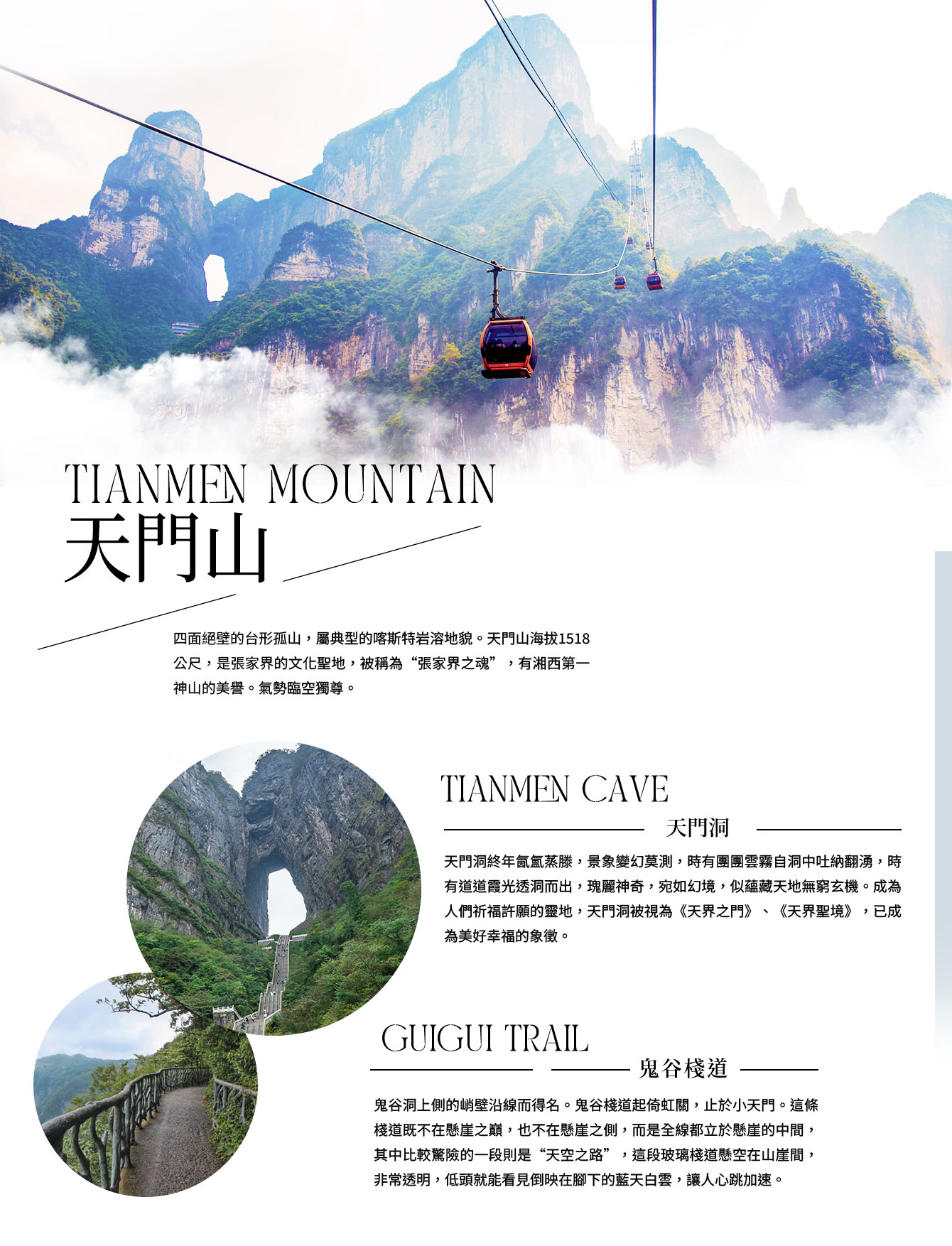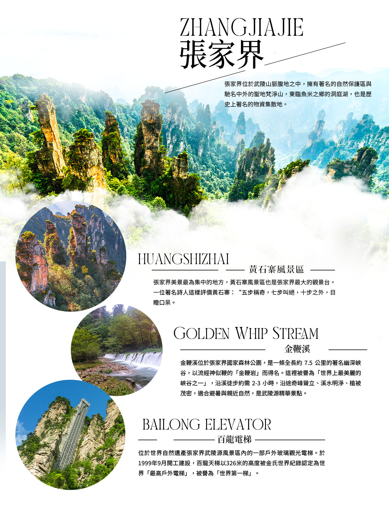 具有自然美景與人造奇觀及三項桂冠獨步世界。特別安排搭乘百龍電梯上山,是世界上最快的客運電梯、載重量最大、最高的觀光電梯、也是世界最高暴露在戶外的電梯。