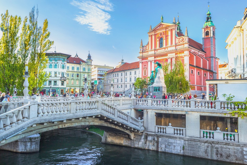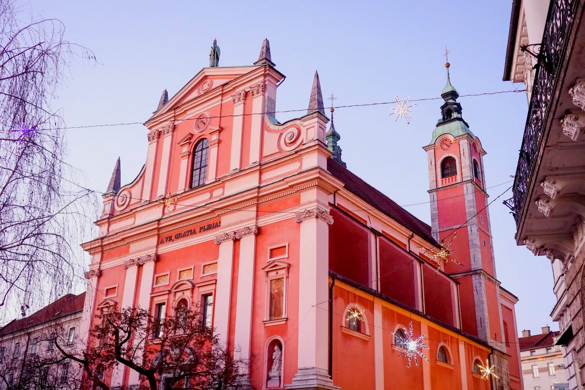 建於1660年的紅色聖方濟教堂,中央廣場位於三橋和龍橋之間,是居民和觀光客喜歡聚集的文藝氣息廣場,沿著盧比安納河前往往屠夫橋、飛龍橋,河畔旁盡是露天咖啡館,悠閒情調,熱鬧的傳統市集都讓人流連忘返,會發現盧比安納的魅力無所不在。