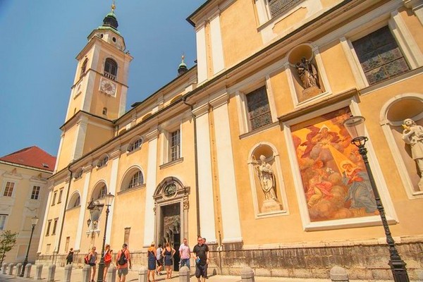 盧比安納的主教座堂,黃色的牆面和湖水綠的屋頂,是1701至1706年,由義大利建築師Andrea Pozzo設計的巴洛克風格。入口處的銅門,為慶祝信奉基督教滿1250週年而建,內部金碧輝煌的雕飾,牆上佈滿了精緻的濕壁畫更令人屏息。