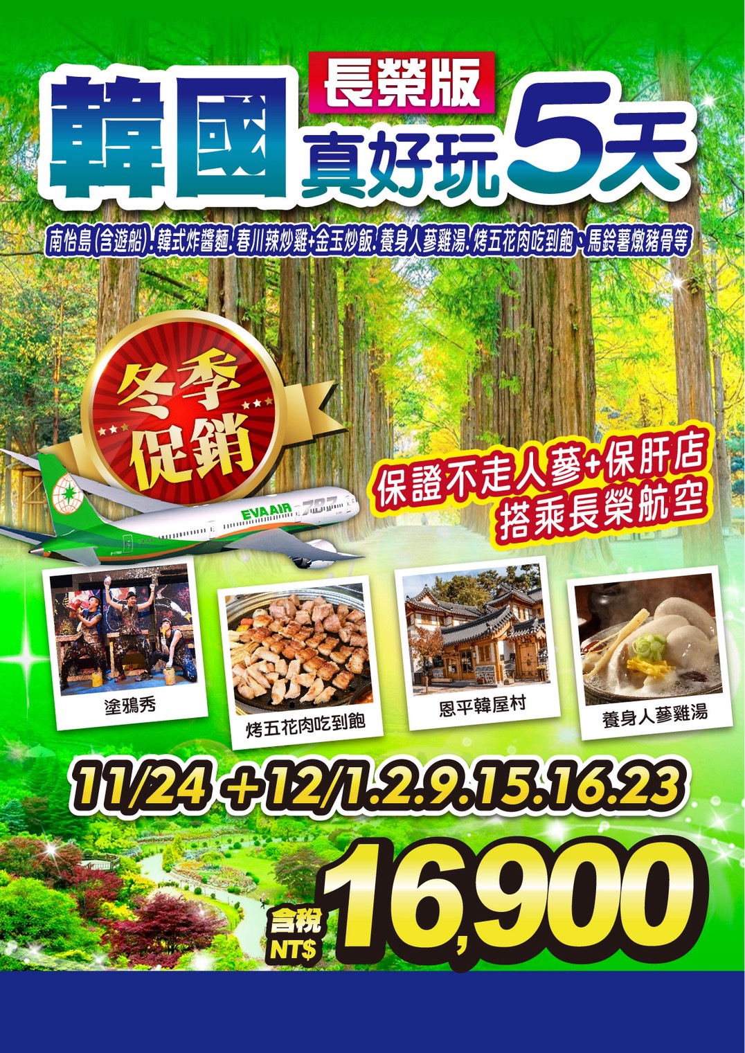 2025/12/23(週二) | 台中國際機場出發 【長榮航空】《不走人蔘+保肝店》韓國真好玩5日~南怡島、晨靜樹木園、採果趣+餵山羊吃草、廣藏市場、復古電動車體驗機位 20 候補0 已售0 可售20 |