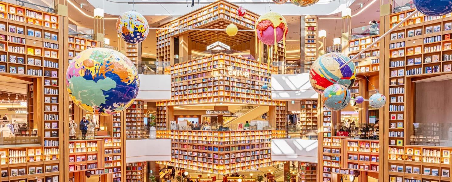 韓國全新地標,水原星空圖書館是韓國第二座星空圖書館,地點位於水原市最大的購物中心Starfield水原裡面,擁有令人印象深刻的空間設計,挑高4層樓的空間氣勢更磅礡、科幻電影般的巨型書塔及宇宙星球的模型,散發著宏偉的氛圍!