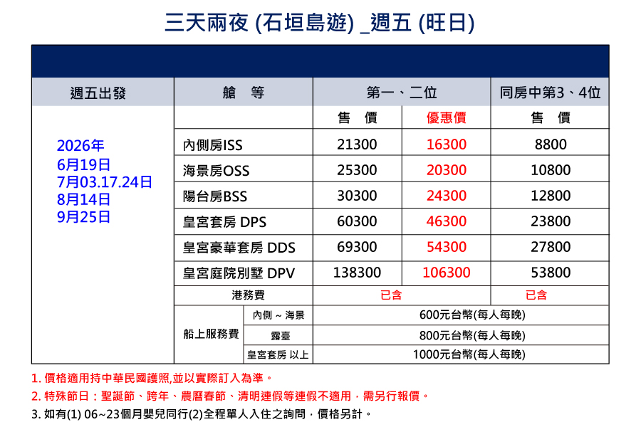 5、郵輪服務費 (每人每晚台幣計)。費用於船上支付。