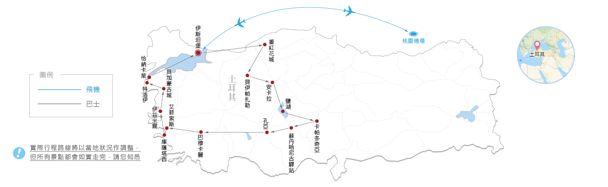 土耳其其行程由於當地狀況、交通規劃與台灣較為不同,相對而言,走路行程不算少。同時有可能因為維護古蹟的考量,古城內的道路狀況多是砌石路面。請考量個人身體健康狀況,參加較為適合之旅遊產品。