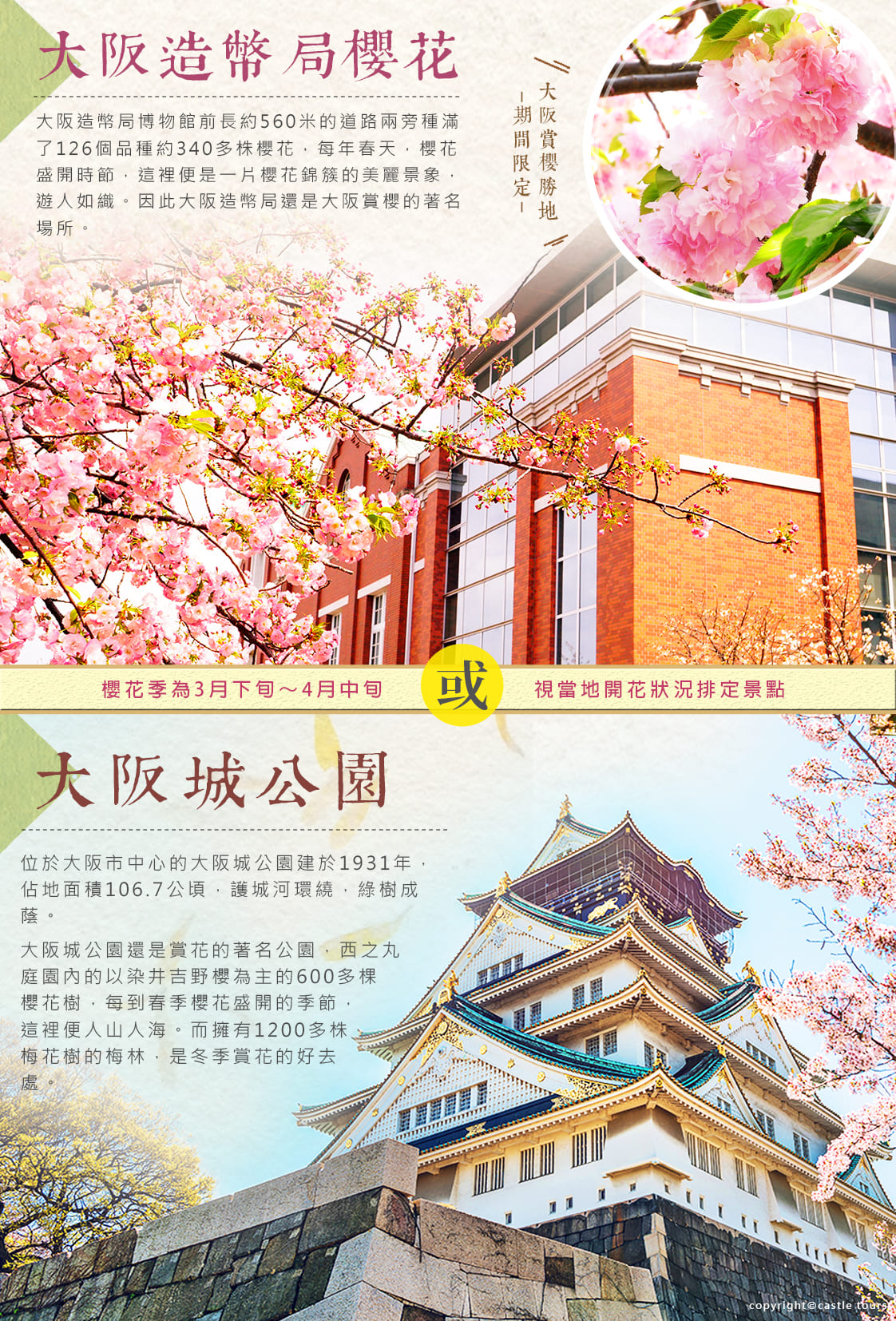 位於大阪市中心的大阪城公園建於1931年,佔地面積106.7公頃,護城河環繞,綠樹成蔭。大阪城公園以大阪城為中心,園內有日本庭園、豐國神社、大阪城音樂廳、梅林、刻印石廣場、西之丸庭園、大阪城弓道場、大阪迎賓館、棒球場等設施,是大阪市民休息或從事娛樂活動的場所。