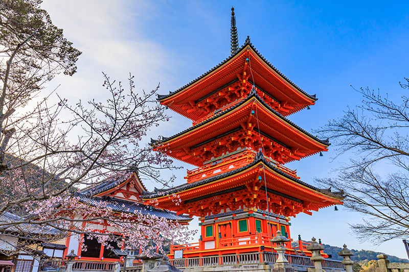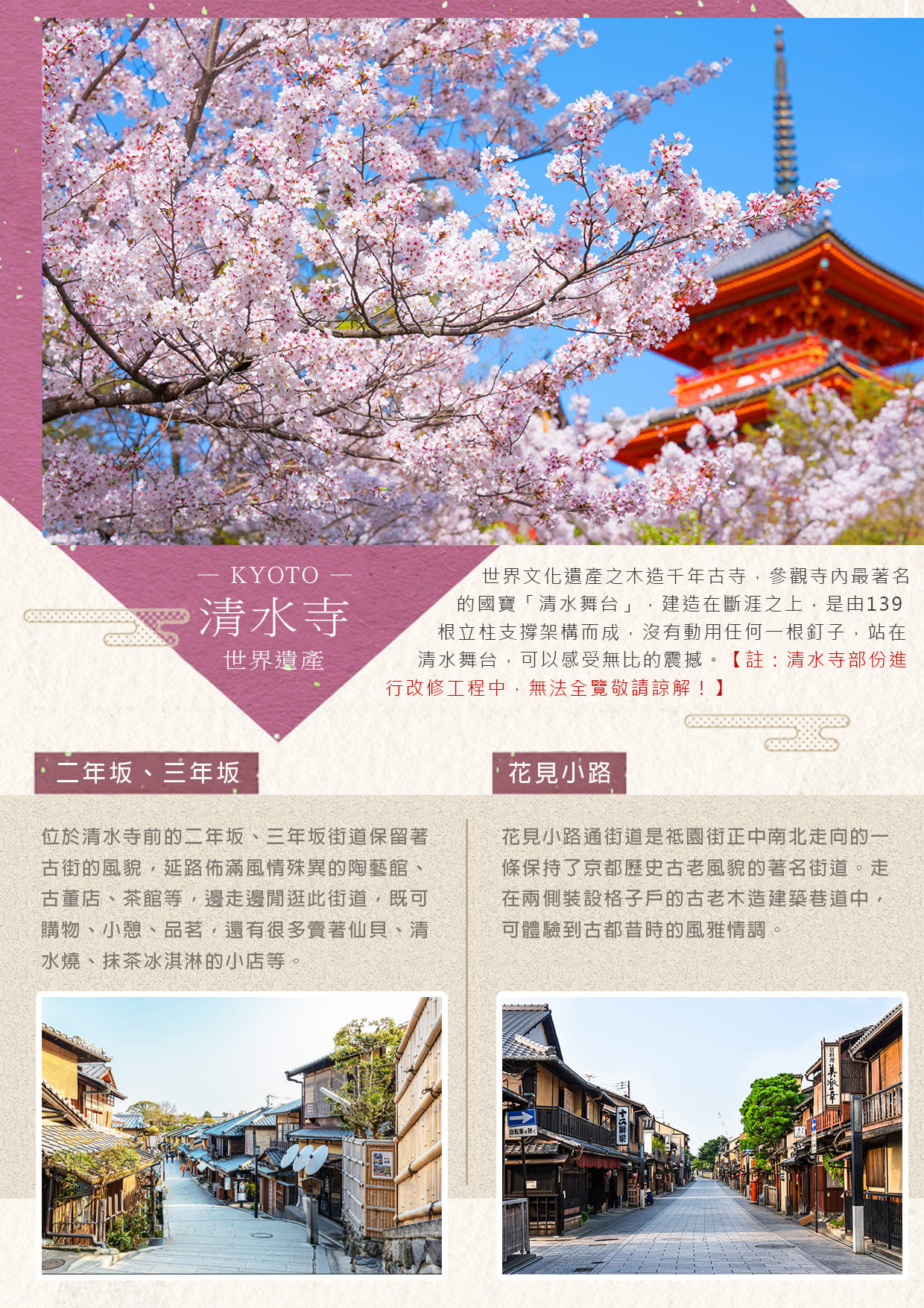 世界文化遺產之木造千年古寺,參觀寺內最著名的國寶「清水舞台」,建造在斷涯之上,是由139根立柱支撐架構而成,沒有動用任何一根釘子,站在清水舞台,可以感受無比的震撼,清水寺的名稱則源於「音羽瀧」,據說飲其水可治百病;供奉月下老人的「地主神社」,戀愛占卜聞名全國,想要祈求良緣的人可別忘了試試姻緣石,據說只要閉著眼睛從石塊的一方筆直走到另一邊摸到石塊,姻緣就會來臨。而位於清水寺前的二年坂、三年坂街道保留著古街的風貌,延路佈滿風情殊異的陶藝館、古董店、茶館等,邊走邊閒逛此街道,既可購物、小憩、品茗,還有很多賣著仙貝、清水燒、抹茶冰淇淋的小店等,除了熱情殷切免費試吃令人印象深刻外,偶而還會看到打扮成藝妓的女子穿梭其間哦。【註:清水寺部份進行改修工程中,無法全覽敬請諒解!】