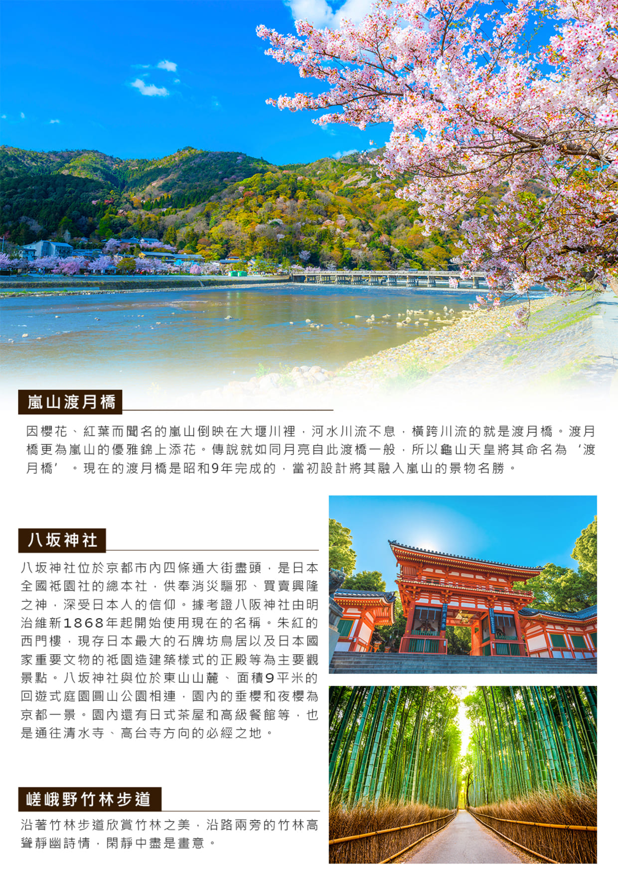 因櫻花、紅葉而聞名的嵐山倒映在大堰川裡,河水川流不息,橫跨川流的就是渡月橋。渡月橋更為嵐山的優雅錦上添花。傳說就如同月亮自此渡橋一般,所以龜山天皇將其命名為‘渡月橋’。現在的渡月橋是昭和9年完成的,當初設計將其融入嵐山的景物名勝。站在渡月橋向四周眺望視野極佳,可以看見嵐峽及嵐山公園的迷人景緻、小橋、流水,一片美麗的世界令人心動,並可以沿著堤岸漫步。