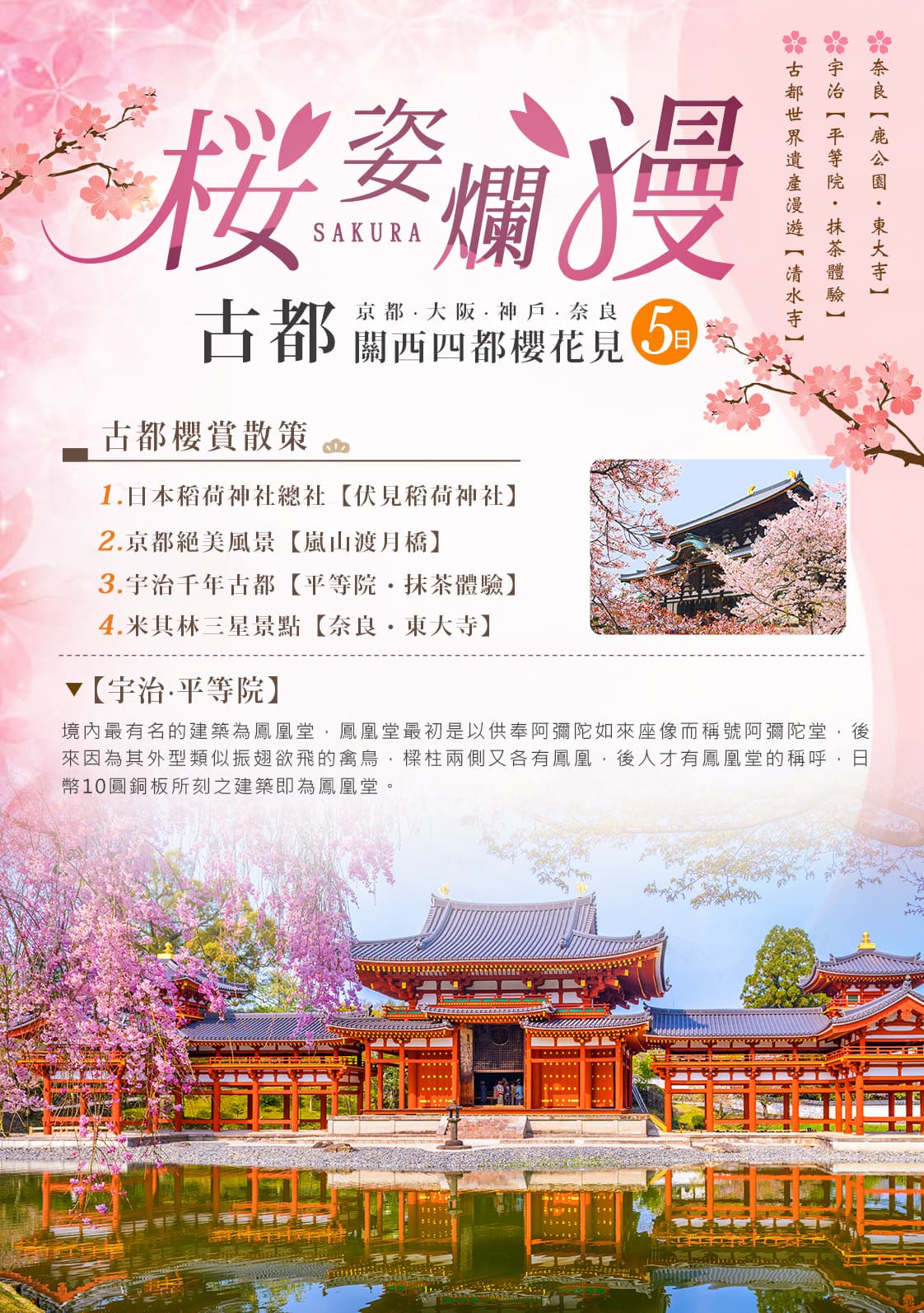 平安時代永承七(公元1052)年,藤原氏政權的全盛期,藤原賴通作為自己的別墅修建了平等院。院內引入了宇治河水,園中櫻花、杜鵑花和蓮花每年噴芳吐艷,藤原力圖在平等院營造一種超脫的仙境和極樂淨土的氣氛。