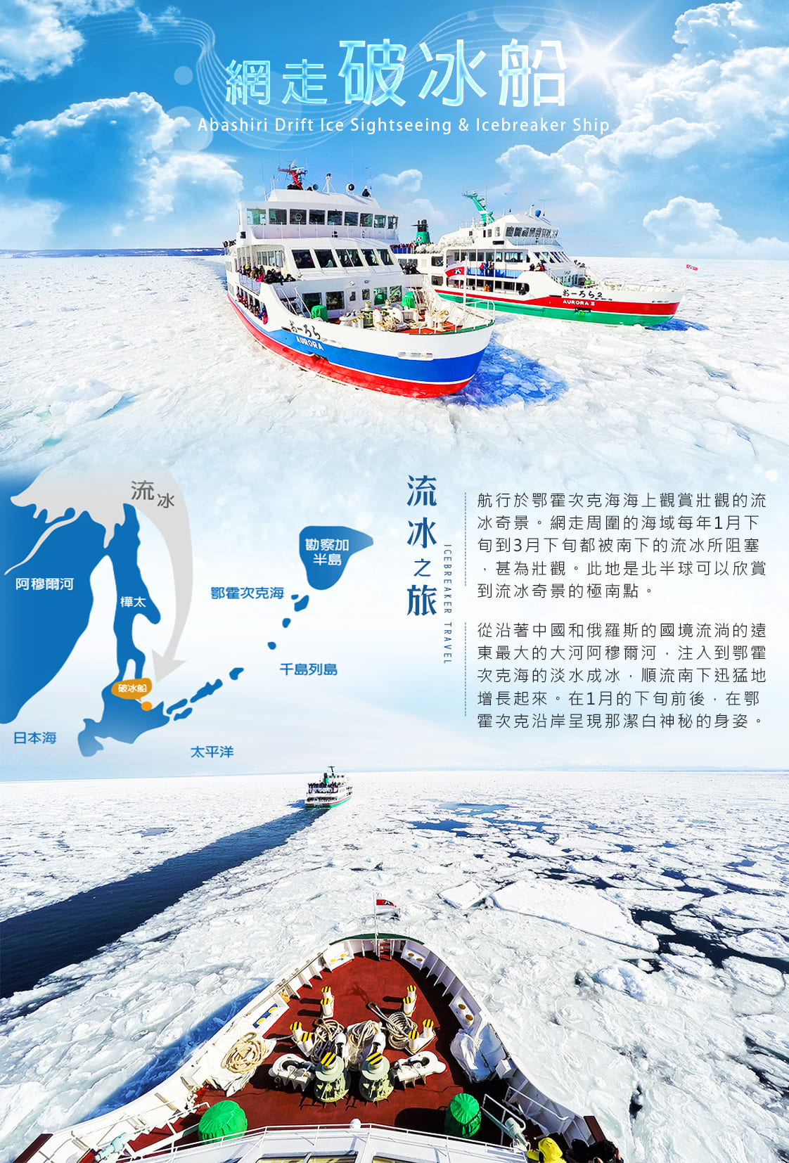 【註】破冰船運行於1月下旬至3月下旬期間,但因大自然氣候暖化的關係導致近年來流冰狀況不穩,或因氣候環境惡劣而偶有無法上船情事,則改走天都山流冰館,敬請諒解!