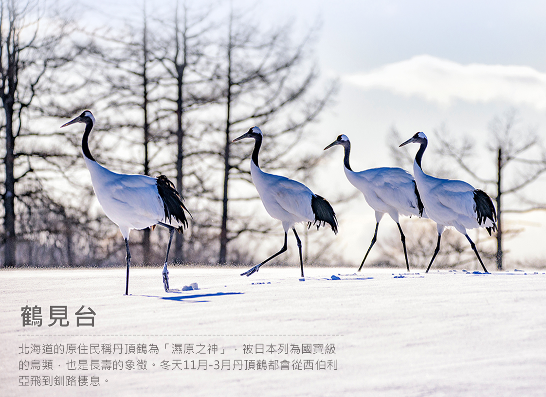 丹頂鶴原本為愛奴族的神明,但在北海道漸漸開發之後,丹頂鶴遭到了獵殺,以致瀕臨絕種的窘境。直到大正13年,日本政府再次在濕原發現的丹頂鶴的蹤跡,因此便下令推行保護丹頂鶴運動,希望能夠將丹頂鶴的美麗流傳下去。目前在鶴見台飼養的丹頂鶴約有五十隻左右,遊客可以遠距離的觀賞丹頂鶴的生活,偶爾也會見到成群的丹頂鶴一同結伴在空中飛翔,場面相當的壯觀。