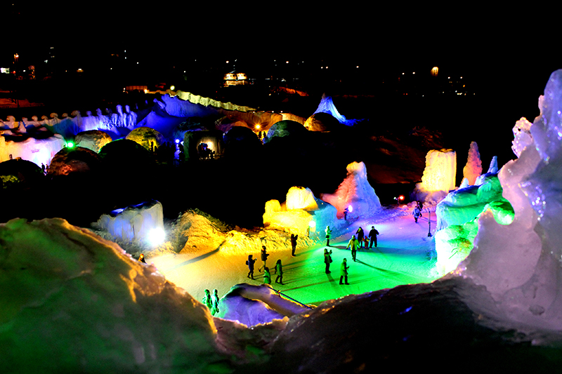 是層雲峽溫泉冬季大型活動,令人震撼的冰瀑林立會場,充滿震撼力的冰柱、冰隧道、還有高達15公尺高的冰製展望台等,層雲峽嚴冬自然力量所形成的各式冰製建築林立眼前,可說是只有北海道才可能體驗的慶典。夜晚燈光打照在冰製建築上,產生與白天截然不同的夢幻氣氛。活動期間還有舉辦觀光客可輕鬆參加的遊戲大會、煙火大會等。從會場步行約3分鐘,即可抵達層雲峽溫泉街。盡情享受嚴寒才有的祭典後,在溫泉中悠閒地溫暖身軀吧!