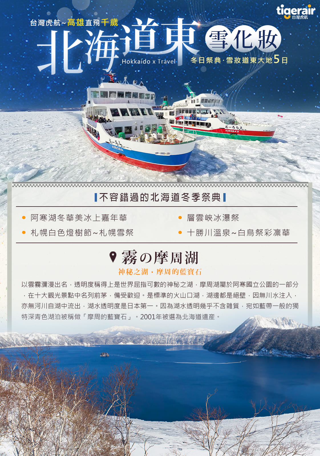 *【支笏湖冰濤祭】日期時間僅供參考,主辦單位保有變更取消之權利。另因住宿飯店調整或車時限制或其它不可抗拒之現象而取消前往不退費,行程安排以當地為主,敬請諒解。