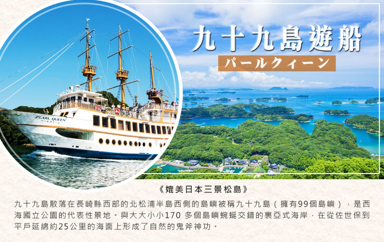 九十九島的海洋、島嶼、天空與海風,以及生息在此的萬物生靈。九十九島珍珠海洋遊覽區的每一個角落都能讓您盡情感受。從九十九島的點點滴滴中請您尋找屬於自己的那份快樂。擁有白色船體的「珍珠皇后號」與紅色船體倒映著島嶼的「海賊王遊覽船未來號」,除此外還有皮划艇等各式各樣的遊船,帶您探尋絕景九十九島。