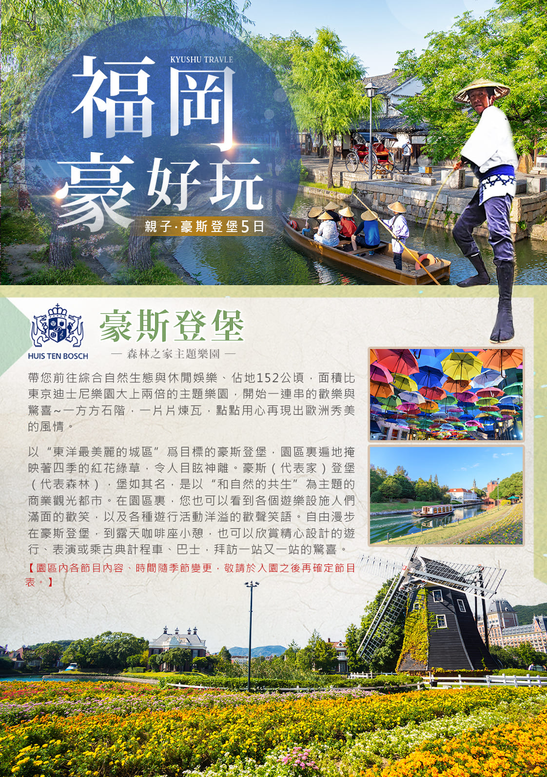 BR【福岡豪好玩】豪斯登堡‧九州自然動物園‧柳川‧湯布院5日