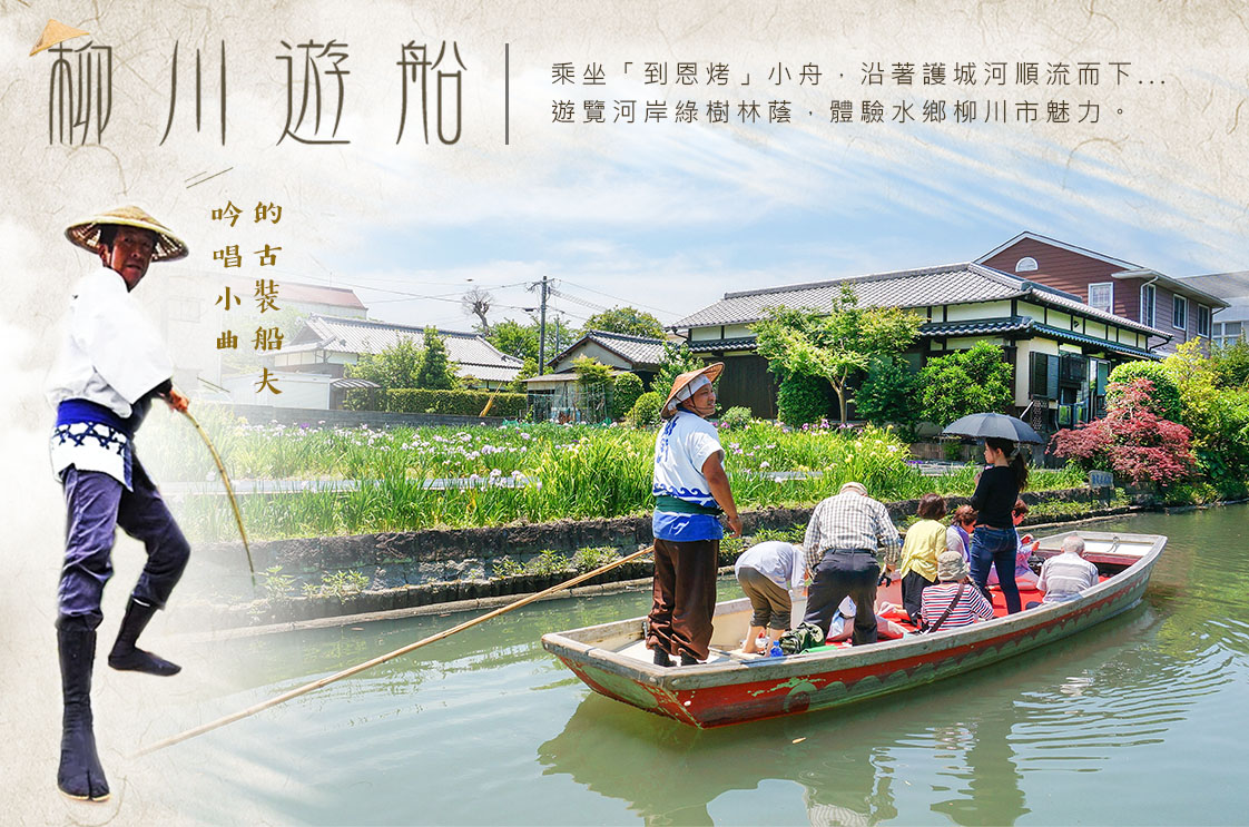 被稱為世界著名水鄉之一的柳川是城中環繞的人工河。在柳川市內縱横交錯,這條人工河原來有守城砦功能,同時也有各種各樣的功能;把過度的雨水暫時蓄存防止河水氾濫的放災功能;可以利用農業用水和消防用水等蓄水功能,對市民非常有利。柳川是一條細長蜿蜒的小河,沿岸花朵、綠樹及紅瓦古建築,古色古香。要體會水鄉之美,唯有船伕擺渡式的泛舟巡訪,才能進入詩篇般的世界。