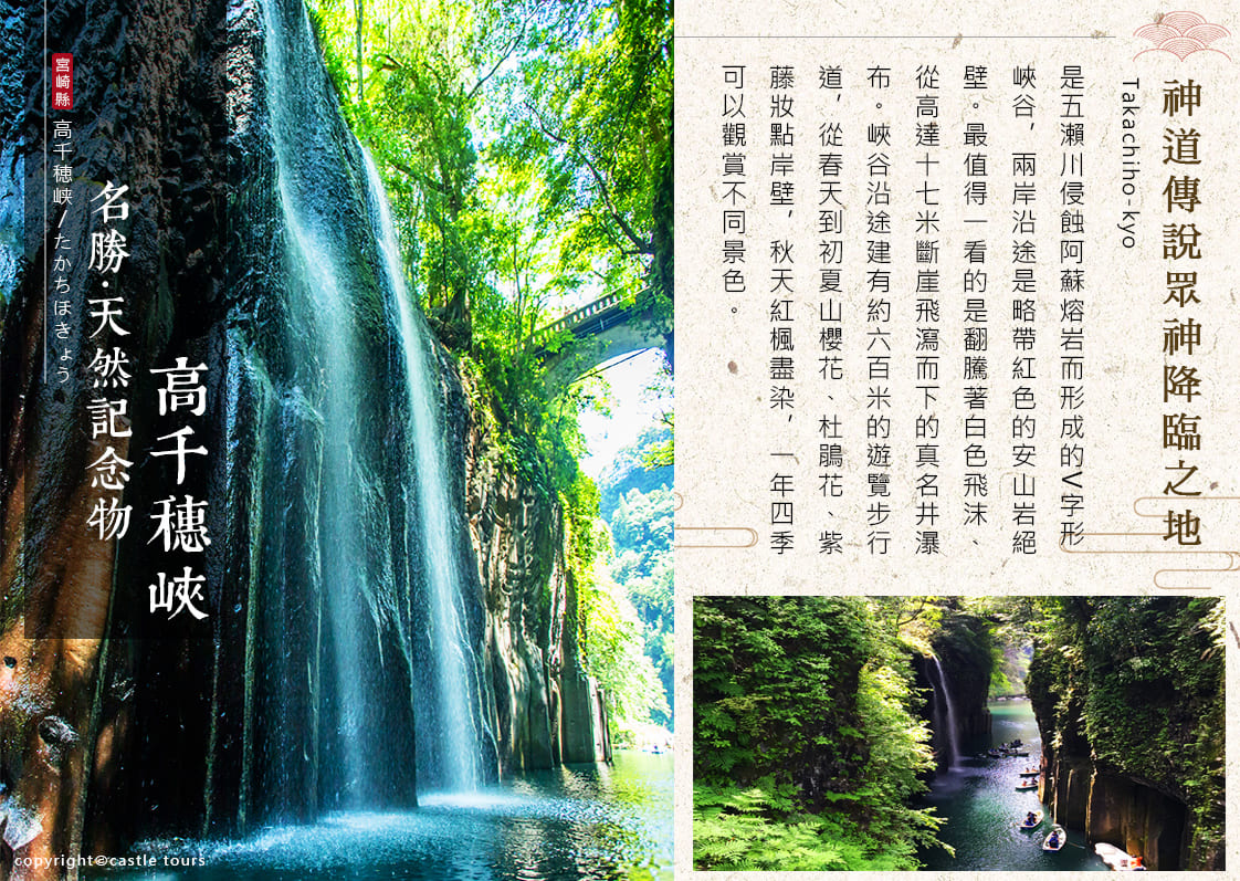 過去阿蘇火山噴發出的火山碎屑流沿著五瀨川流動,急速冷卻後形成柱狀節理,造就了高千穗峽溪谷壯麗的懸崖景色。尤其以真名井瀑布的17公尺落差最為雄偉、震撼。