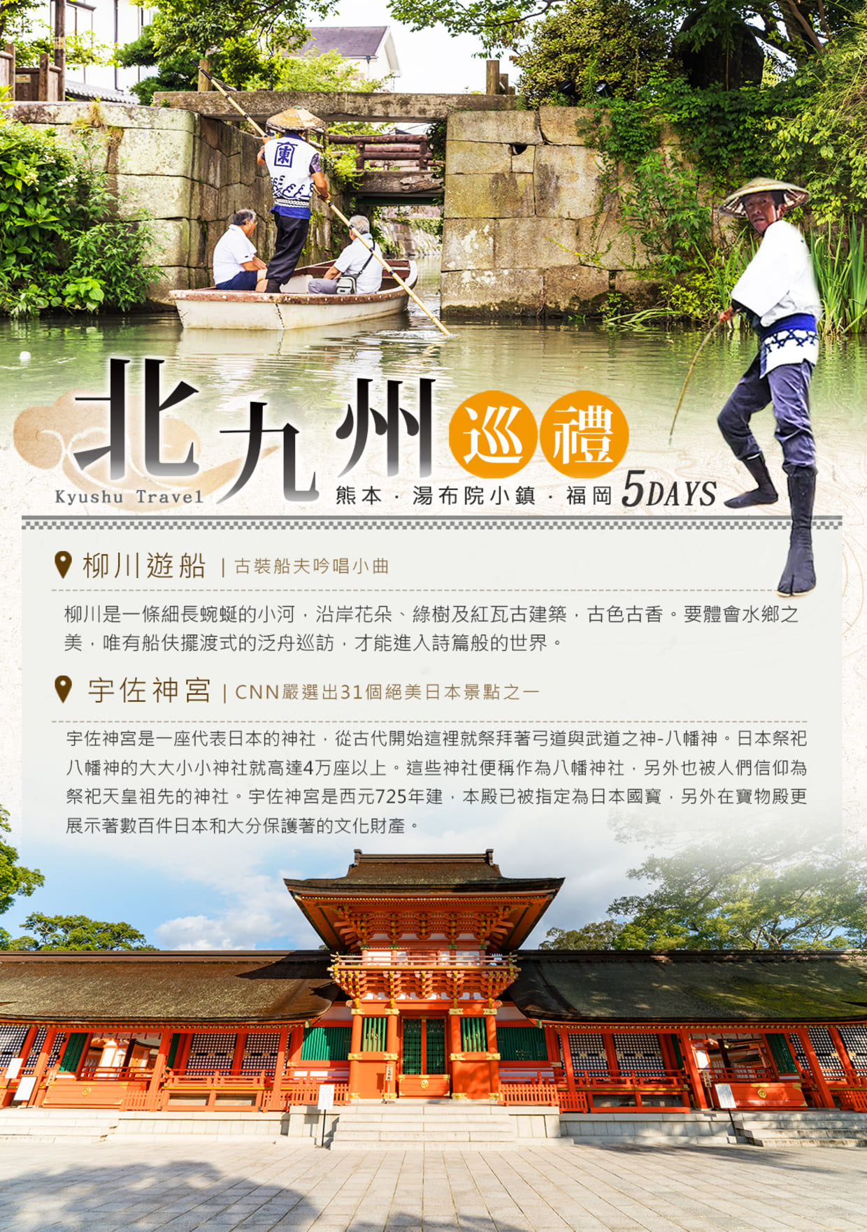 HTL🚌古裝船夫吟唱小曲~【柳川遊船】🚌【山鹿古街】散策~八千代座~燈籠民藝館🚌熊本空港🛫高雄小港國際機場