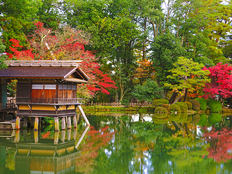 【兼六園】日本三大最美麗的花園之一,是金澤的必遊之地。 兼六園這個名字的意思是“兼備六大因素”,代表了花園令人驚嘆的壯麗美景:廣闊、寧靜、人工、古老、流水和壯麗景色。庭園面積11.4公頃,位於金澤市中心的高處,毗鄰金澤城。是封建時代統治加賀藩(現在的石川和富山地區)的前田家族歴代維護整修的花園。被認為是日本最美麗的大名庭園之一。兼六園内最令人驚嘆的景點之一是名為「霞池」的大型人工池塘。靠近池塘中心的是蓬莱島。池塘象徵著大海,而蓬莱島是意指在海上的神聖島嶼,據信有一位擁有神奇力量的長生不老的隱士居住在上面。因此,池塘和島嶼的建造象徵著加賀藩的長壽和永恆的繁榮。