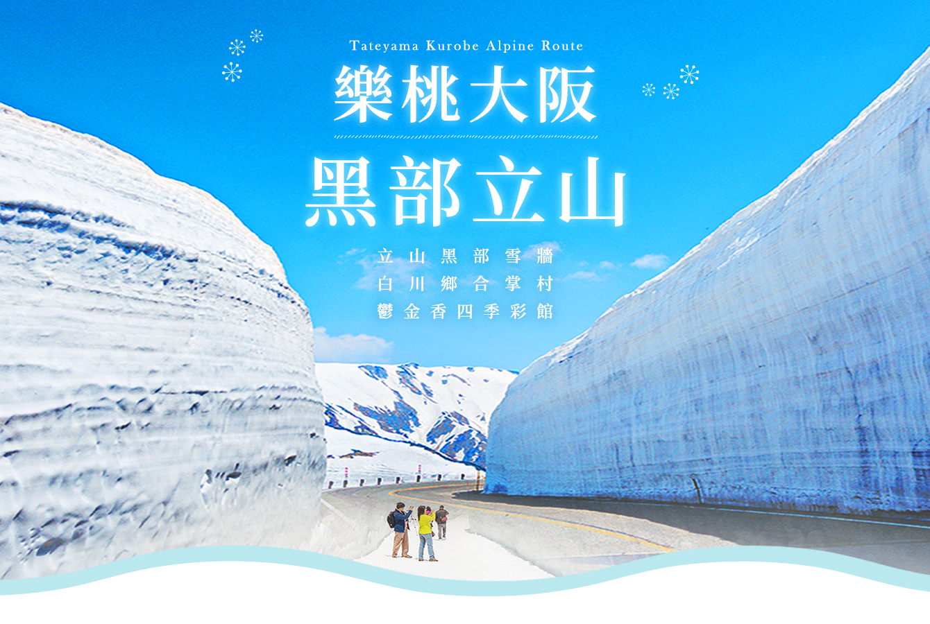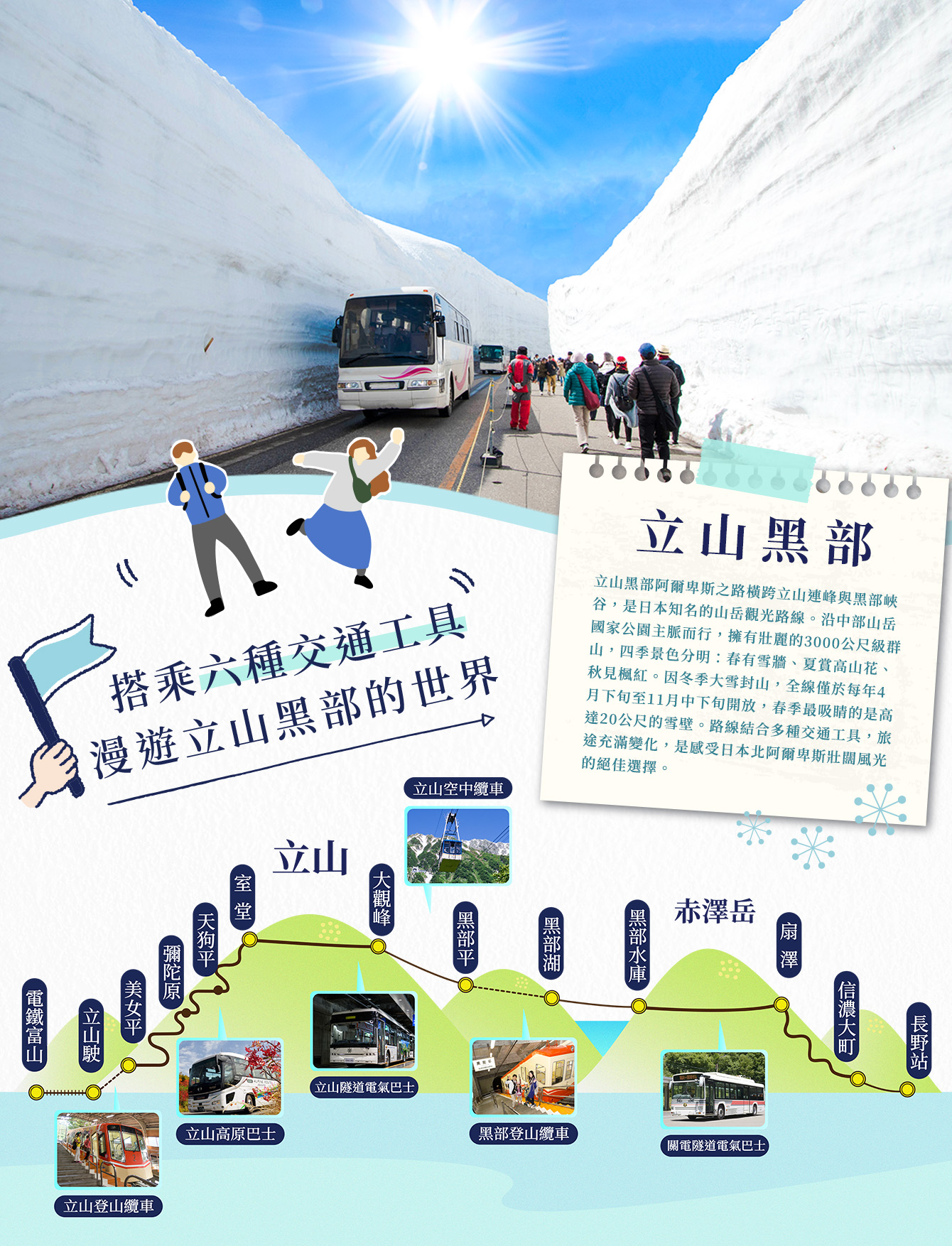 特別報告:立山黑部地區為2500米高度的山地,氣溫與平地有很大的差別,請事先準備適當保暖衣物、帽子。另外,白雪容易反光請注意防曬或攜帶太陽眼鏡等。建議帶防滑好走的鞋(或加防滑墊)方便行走,以策安全。若遇旺季人潮過多、依照官方交通工具運能限制,則部分交通工具,將微調整為「臨時直通巴士」。並依行程流暢度微調整午餐改為「山下用餐 立山日式風味御膳」或「 山上用餐 立山日式風味御膳餐盒 」。