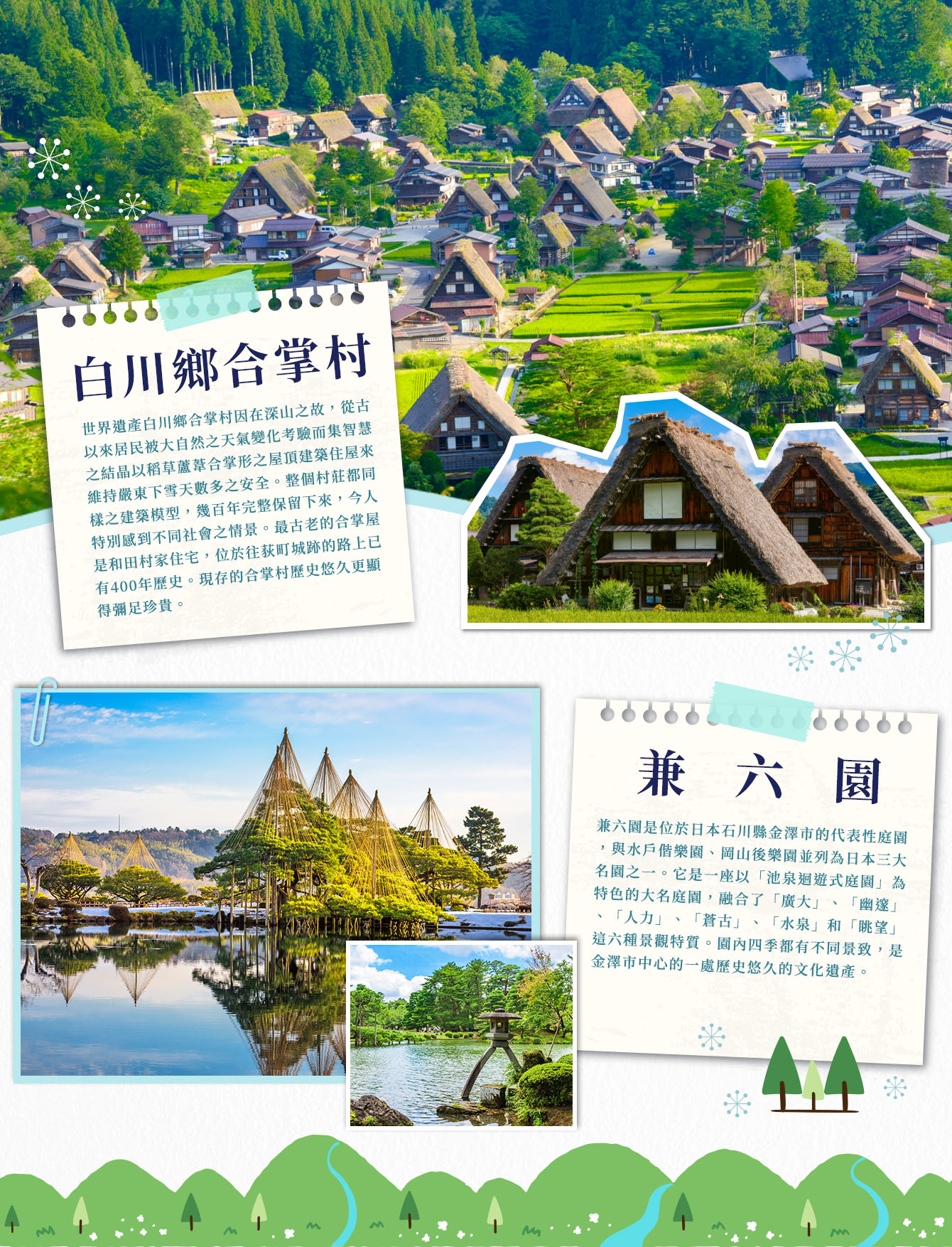 【白川鄉合掌村】世界遺產「合掌村」分布在岐阜縣大野郡白川村(白川鄉),富山縣東礪波郡平村與上平村(五箇山)。目前白川鄉內共有5座合掌村落,其中荻町的規模最大也最有名,至今完整保留113棟合掌造。荻町在觀光方面最充実,有超過20間民宿及旅館、約50家特產店、餐廳、重要文化遺產和田家、明善寺鄉土館、生活資料館等是欣賞合掌村的最佳景點。