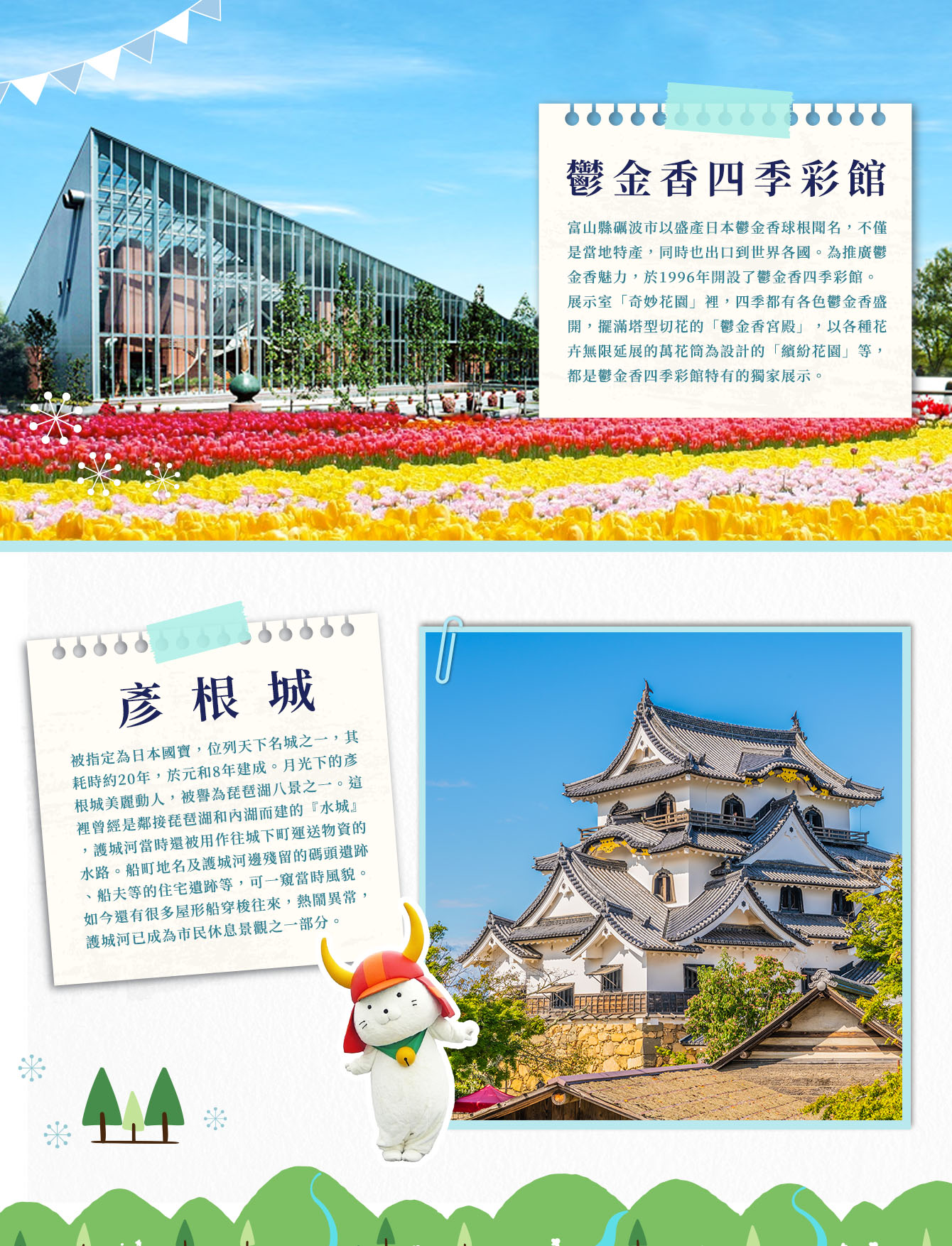 【鬱金香四季彩館】富山縣礪波市以盛產日本鬱金香球根聞名,不僅是當地特產,同時也出口到世界各國。為推廣鬱金香魅力,於1996年開設了鬱金香四季彩館。展示室「奇妙花園」裡,四季都有各色鬱金香盛開,擺滿塔型切花的「鬱金香宮殿」,以各種花卉無限延展的萬花筒為設計的「繽紛花園」等,都是鬱金香四季彩館特有的獨家展示,不容錯過。
