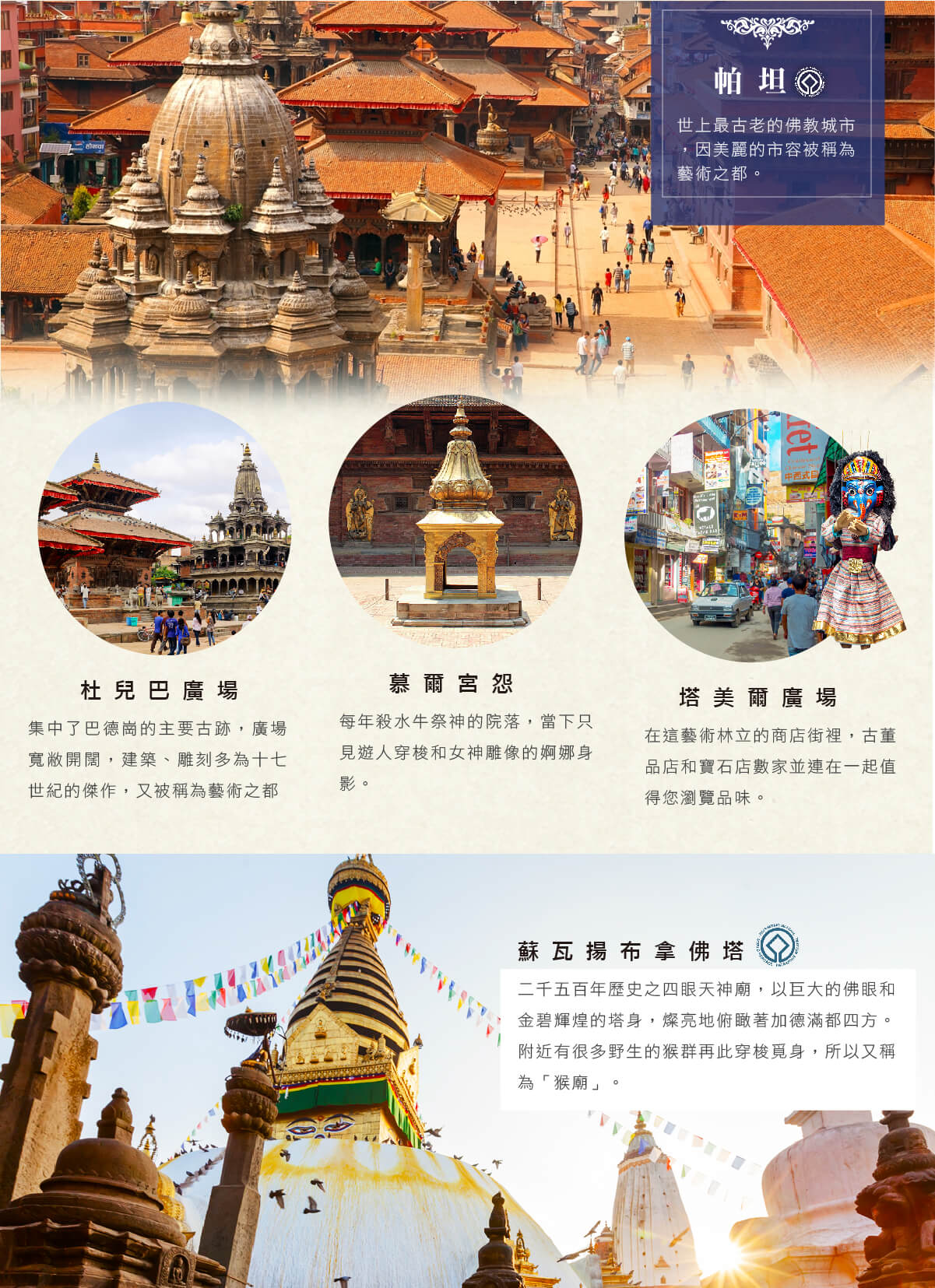 02.宗教:尼泊爾境內80%的人口信奉印度教,8%的人信奉佛教。當地的印度教早已與佛教密切交融,也因此衍生出另一種獨特的宗教以及相關的神明、儀式和慶典。