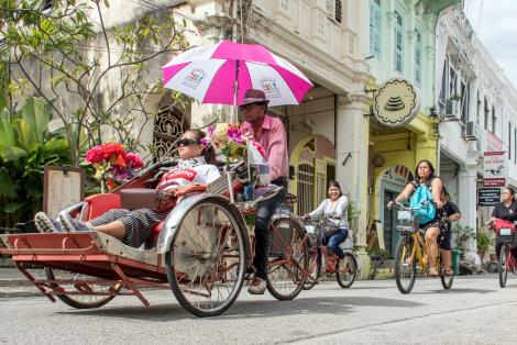 喬治市的三輪車遊是一個非常悠閒的旅程,遊客可以坐在三輪車上,由當地的車夫帶領,輕鬆地穿梭於喬治市的歷史街區。這讓遊客有更多的時間和空間去欣賞這些迷人的老建築、壁畫、街道風情以及各種文化景觀。