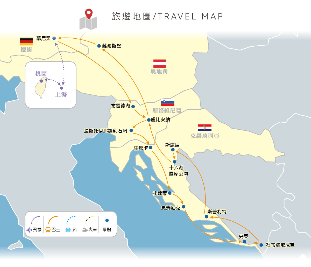 🚌【參考行車時間距離】:布雷德湖區-30KM/30MIN-盧比安納-53KM/1H-波斯托伊納溶洞-68KM/1H-里耶卡