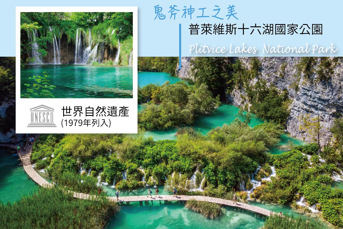 【十六湖國家公園】有「歐洲九寨溝」美譽及世界自然遺產的普利特維切國家公園。此地建立於1949年,山、水、森林彷若一體,美麗而特殊的景色更是聞名歐洲的森林國家公園,且於1979年入選聯合國教科文組織UNESCO列為世界自然遺產,它是克羅埃西亞人最值得驕傲的自然景觀。之所以吸引人,在於它美不勝收且豐富多變的地形地貌美景,四季都呈現不同的風情春季瀑布、夏季蒼翠、秋季楓紅、冬季皚雪。園內的石灰岩台階在落差中造就瀑布處處,16座湖泊分別散列各區,故有「16湖國家公園」的稱號,湖水呈現什麼顏色要看水的深度、礦物質含量、藻類甚至光線的折射而定,因此每座湖泊各有不同的氣質。
