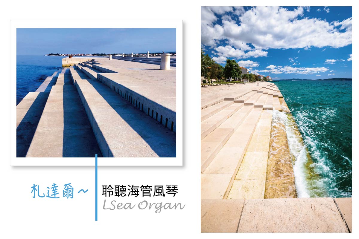 【海管風琴】石階上安插著多根管子,經由海浪及潮汐的拍打,產生那悠揚悅耳的海風琴聲,伴隨著落日彩霞,蔚然成為亞德里海的浪漫情懷。