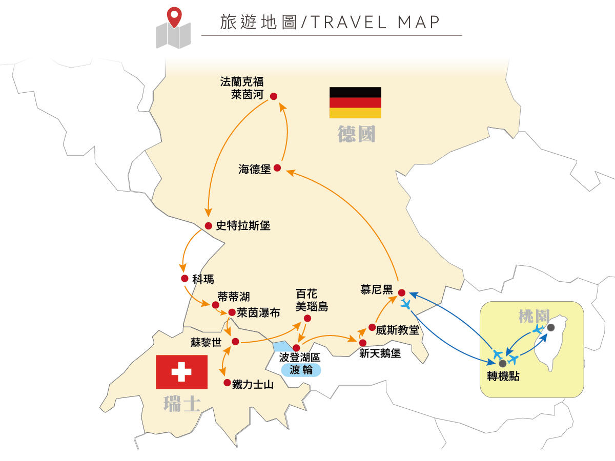 德國瑞士浪漫之旅的尾端,心中美好的風景和團員們一路上的歡笑,今天帶著依依不捨的心情前往機場,由領隊協助辦理登機手續,搭乘豪華客機經由上海轉機,返回桃園國際機場。