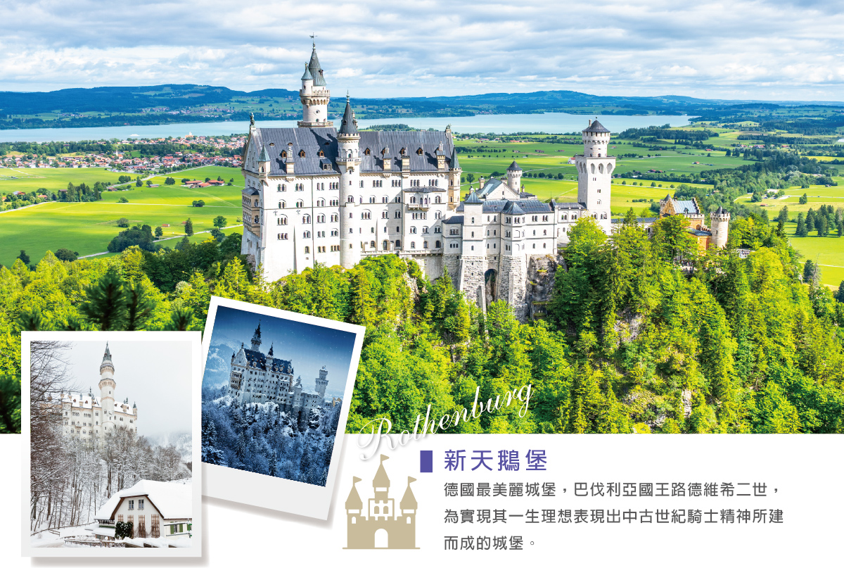 【新天鵝堡】1869年巴伐利亞國王路德維希二世,為實現其一生理想表現出中古世紀騎士精神所建而成的城堡。城堡的最初草稿為劇院畫家與舞臺設計者所創造,故使其保有如夢如幻的不真實感,讓人怦然動心。他與著名作曲家瓦格納的交往因過度揮霍以及公私不分,遭內閣人士與人民的強烈反對,瓦格納的最終被迫離開慕尼黑,使路易二世愈加厭惡慕尼黑,而傾心於巴伐利亞山區。