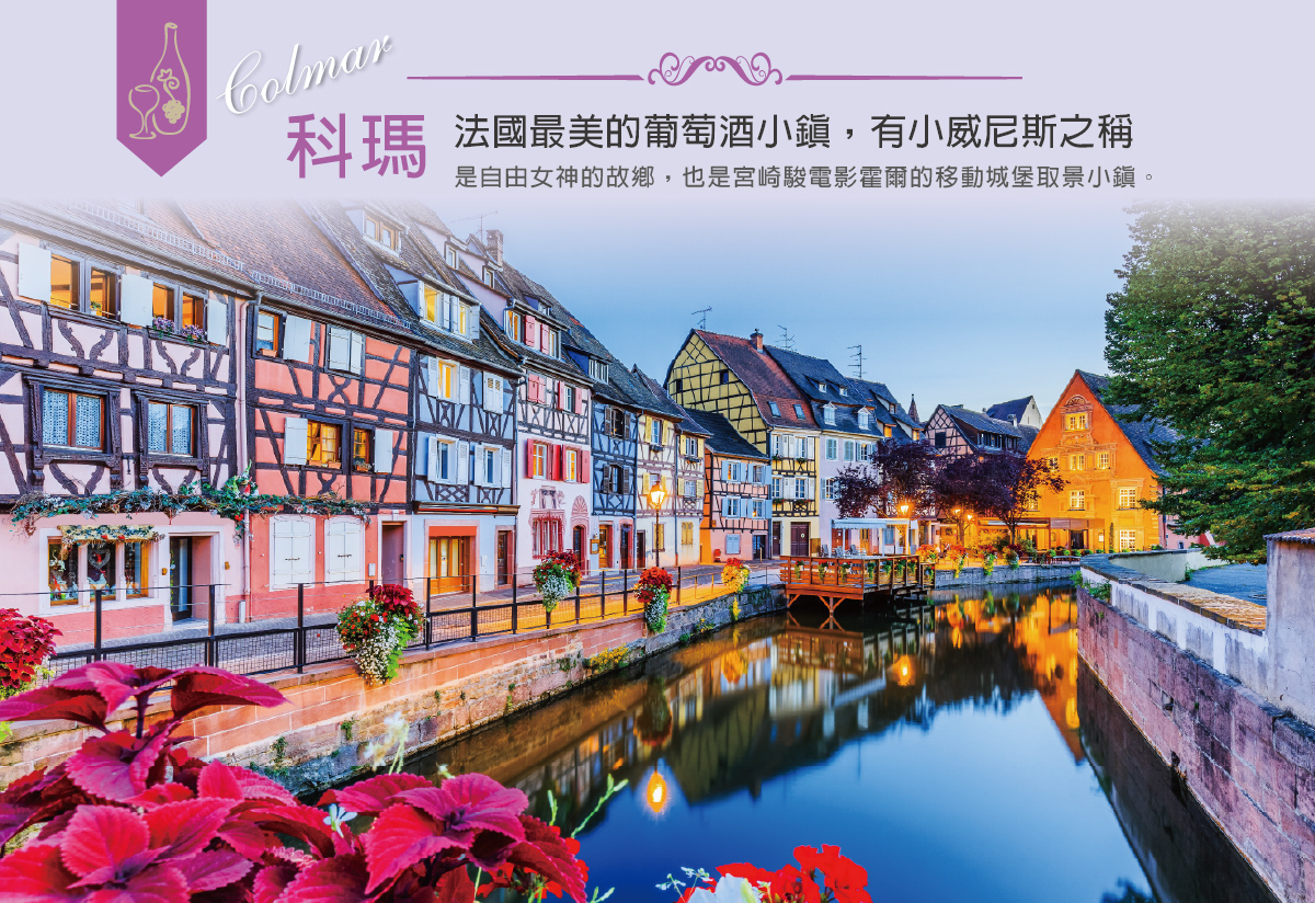 【科瑪】有法國《小威尼斯》之稱。小威尼斯雖是舊時漁人生活的遺跡,卻佈滿了各種不同顏色的花草與半木造屋,鵝黃、水藍、草綠,在此或用或漫步,有如置身仙境。