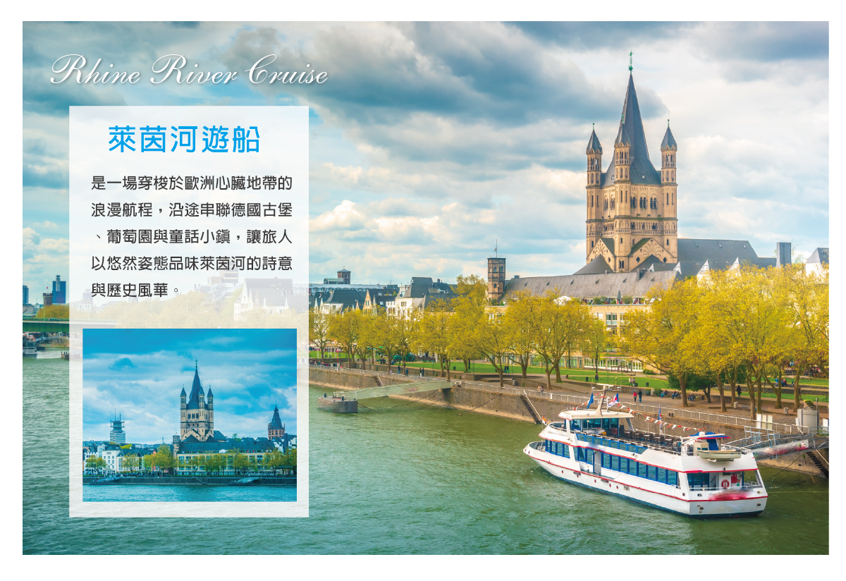 【萊茵河】萊茵河全長約1,232公里,通航區段為883公里,流域面積約17萬平方公里,是歐洲最長的河流之一,同時也是世界上最繁忙的流域之一。延綿65公里的萊茵河中游河谷,與河畔的古堡、歷史小城、葡萄園一起生動地描述了一段人類與變遷的自然環境相互影響的漫長歷史。幾個世紀來,這裏發生的眾多歷史事件、演繹的許多傳奇,對作家、藝術家和作曲家產生了很大影響。在2002年聯合國教科文組織列為文化自然遺產。我們特別精選這一段美麗航程★搭遊輪讓您近距離欣賞沿途河岸風光。