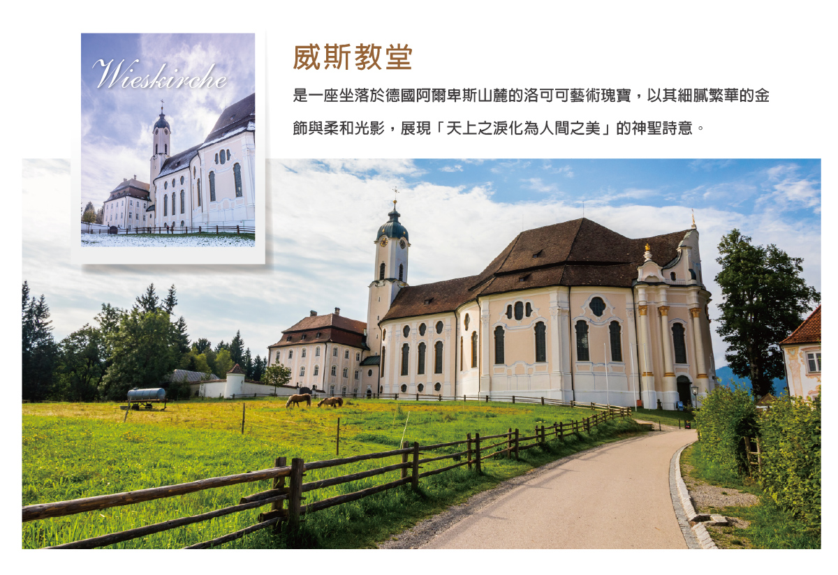 【威斯教堂】此教堂於1983年被列為聯合國教科文組織所保護的世界遺產,為洛可可式建築,於18世紀德國宗教建築中最崇高傑作,被稱為「巴伐利亞草原奇蹟」。