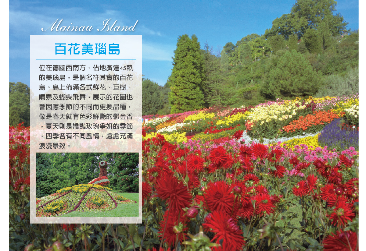 【百花美瑙島】位在德國西南方、佔地廣達45畝的美瑙島,是個名符其實的百花島。島上佈滿各式鮮花、巨樹、噴泉及蝴蝶飛舞,展示的花園也會因應季節的不同而更換品種,像是春天就有色彩鮮艷的鬱金香,夏天則是嬌豔玫瑰爭妍的季節,四季各有不同風情,處處充滿浪漫景致。大約25萬的鬱金香,杜鵑,玫瑰的香味。棕櫚樹和柑桔類植物的地中海風情。園區內的花卉以及花圃的設計會隨季節有不同的變化。